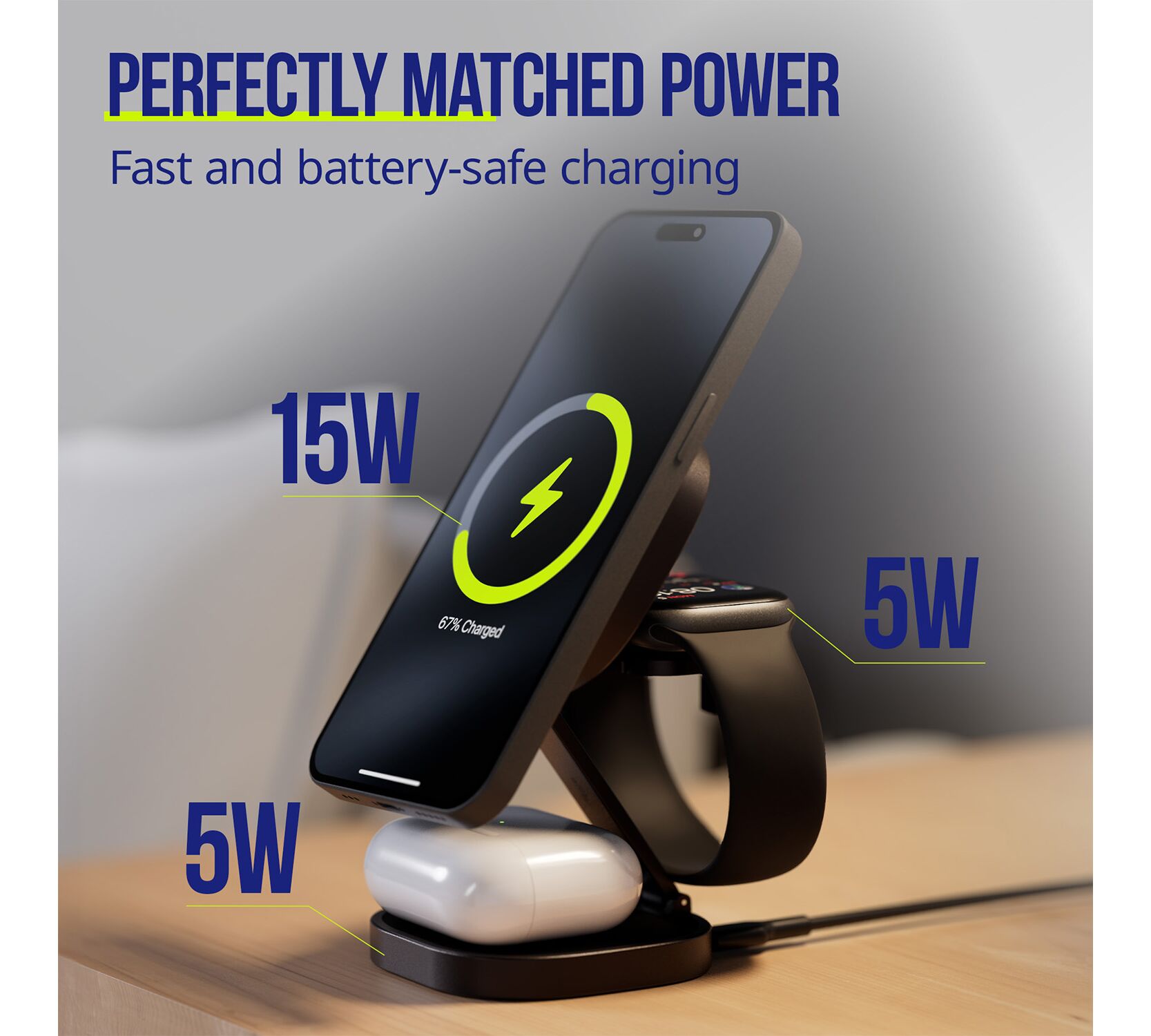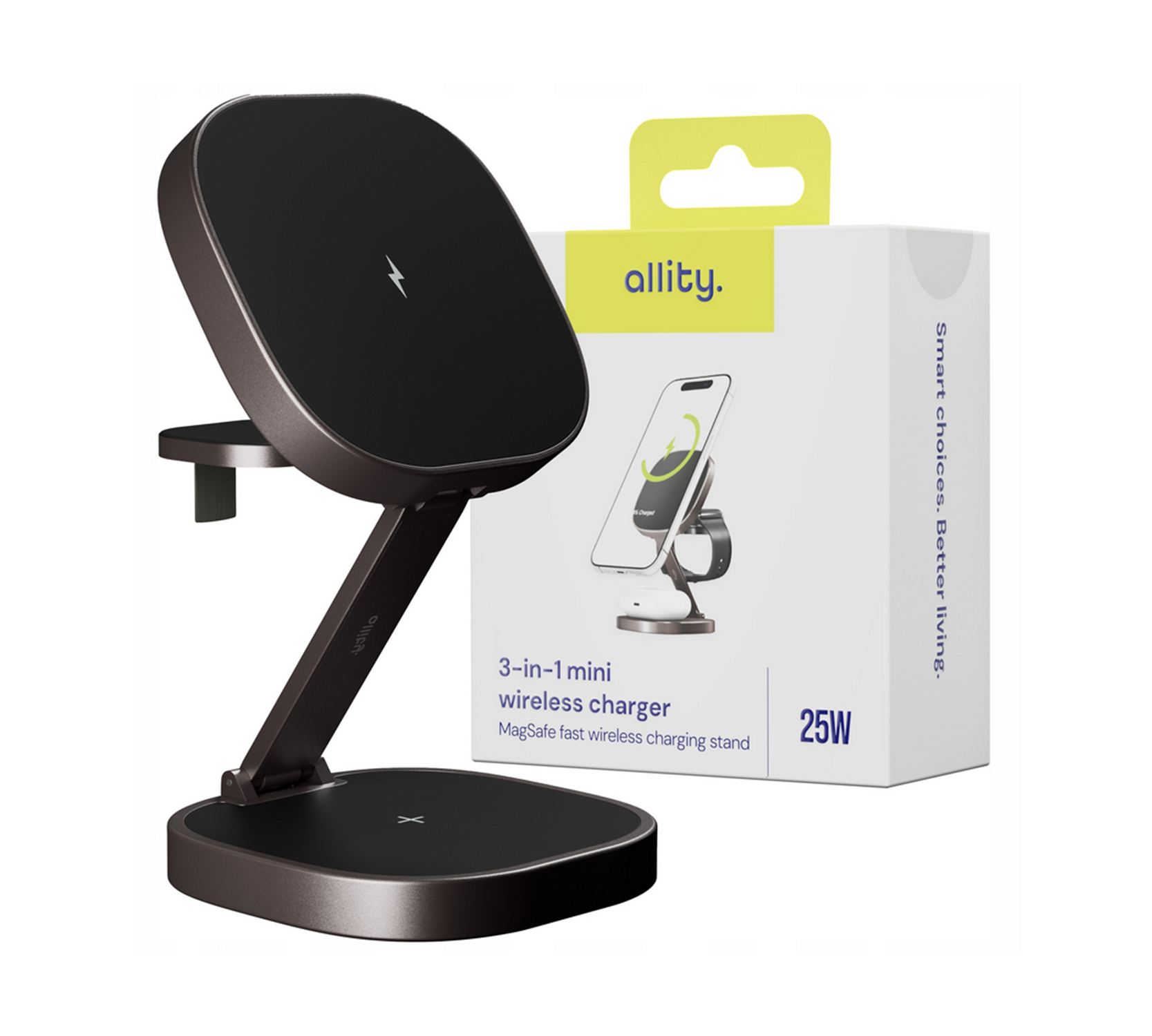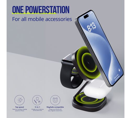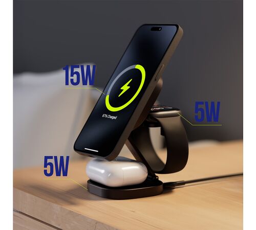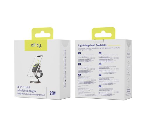Με ισχύ 25W και υποστήριξη τεχνολογίας MagSafe, παρέχει εξαιρετικά γρήγορη φόρτιση για έως τρεις συσκευές ταυτόχρονα – ιδανικός για καθημερινή χρήση στο γραφείο και στο σπίτι. Ο μοντέρνος σχεδιασμός σε γραφίτη αναδεικνύει τον μοναδικό του χαρακτήρα, ενώ η συμπαγής κατασκευή τον καθιστά ιδανικό και για ταξίδια. Ο φορτιστής είναι συμβατός με ευρύ φάσμα συσκευών, συμπεριλαμβανομένων των iPhone, ακουστικών και έξυπνων ρολογιών. Η συσκευασία περιλαμβάνει καλώδιο USB-C, οπότε το προϊόν είναι έτοιμο για χρήση αμέσως μετά το άνοιγμα της συσκευασίας. Ο Allity AWC-220-25WMS επαναπροσδιορίζει τα πρότυπα ευκολίας και λειτουργικότητας, συνδυάζοντας την κομψότητα με απαράμιλλη απόδοση.