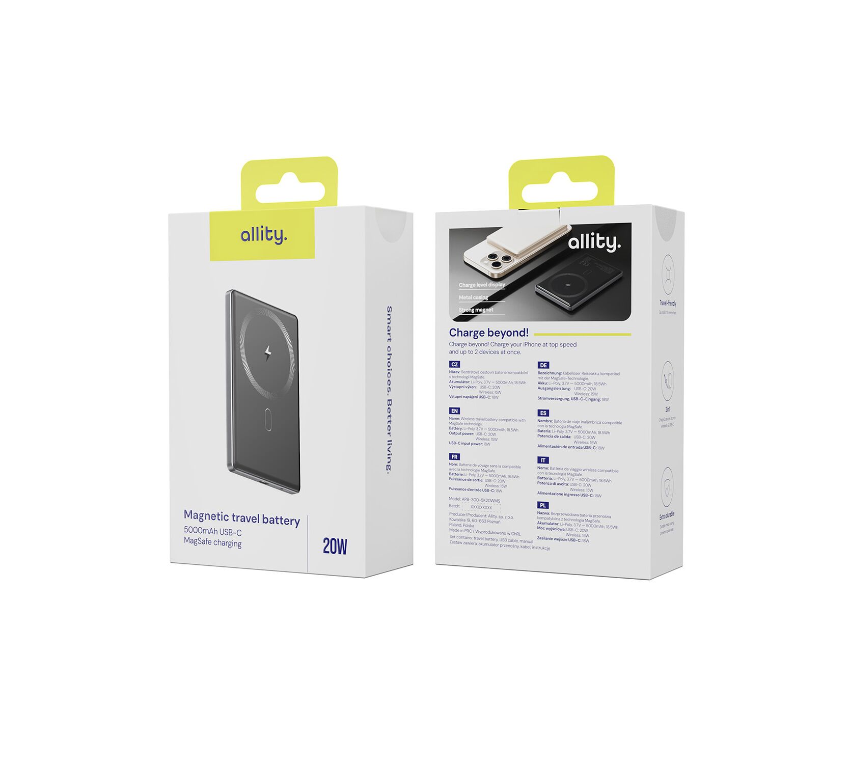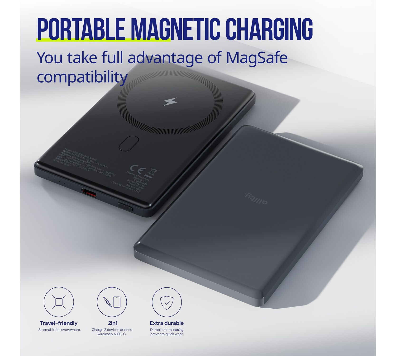 Με τη λειτουργία 2-σε-1, μπορείτε να φορτίζετε δύο συσκευές ταυτόχρονα – μία με καλώδιο και την άλλη ασύρματα. Είναι εξαιρετική επιλογή για όσους αναζητούν αξιοπιστία, ευκολία και μοντέρνο στυλ σε μία συσκευή. Επιλέξτε το Allity APB-300 – τον φορητό, μαγνητικό τρόπο σας για φόρτιση!