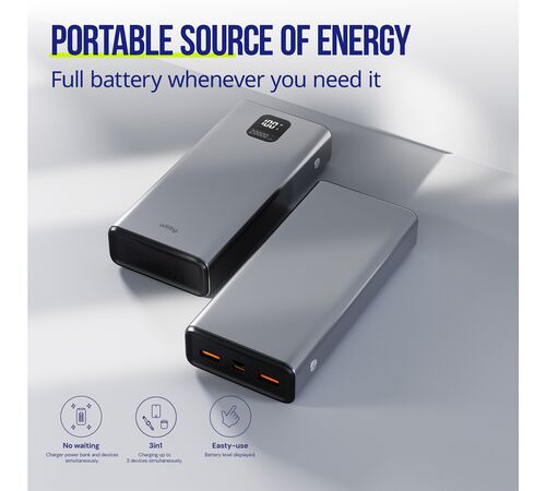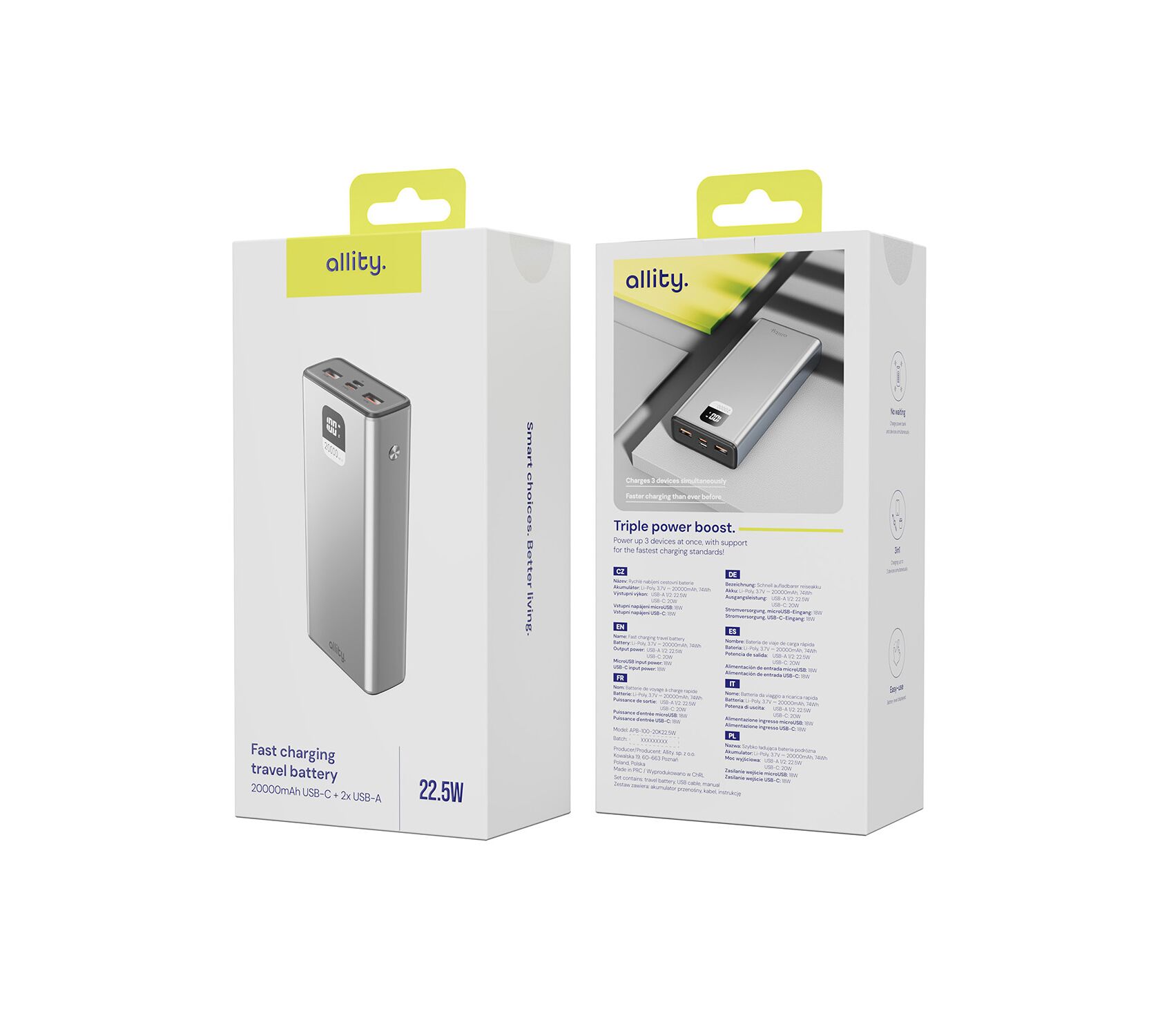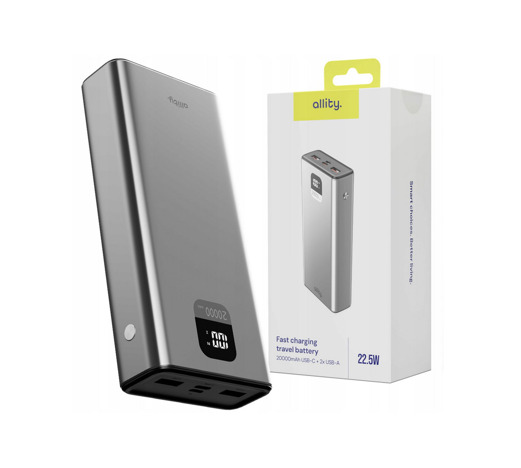 Με ισχύ 22,5 W και χωρητικότητα 20.000 mAh, μπορείτε εύκολα να φορτίσετε το smartphone, το tablet ή άλλες συσκευές σας πολλές φορές πριν χρειαστεί ενίσχυση ισχύος. Ο συμπαγής, κομψός σχεδιασμός του σε γκρι ταιριάζει τέλεια σε έναν σύγχρονο τρόπο ζωής. Η ανθεκτική κατασκευή και το ελαφρύ περίβλημα κάνουν το APB-100 να χωράει σε οποιαδήποτε τσάντα ή τσέπη. Η ευκολία χρήσης και η ευελιξία είναι τα μεγαλύτερα πλεονεκτήματά του – λειτουργεί με τις περισσότερες συσκευές που είναι διαθέσιμες στην αγορά. Επιλέξτε το Allity APB-100 αν αναζητάτε την τέλεια ισορροπία μεταξύ απόδοσης και ευκολίας. Εμπιστευτείτε την ισχύ που είναι πάντα στη διάθεσή σας!