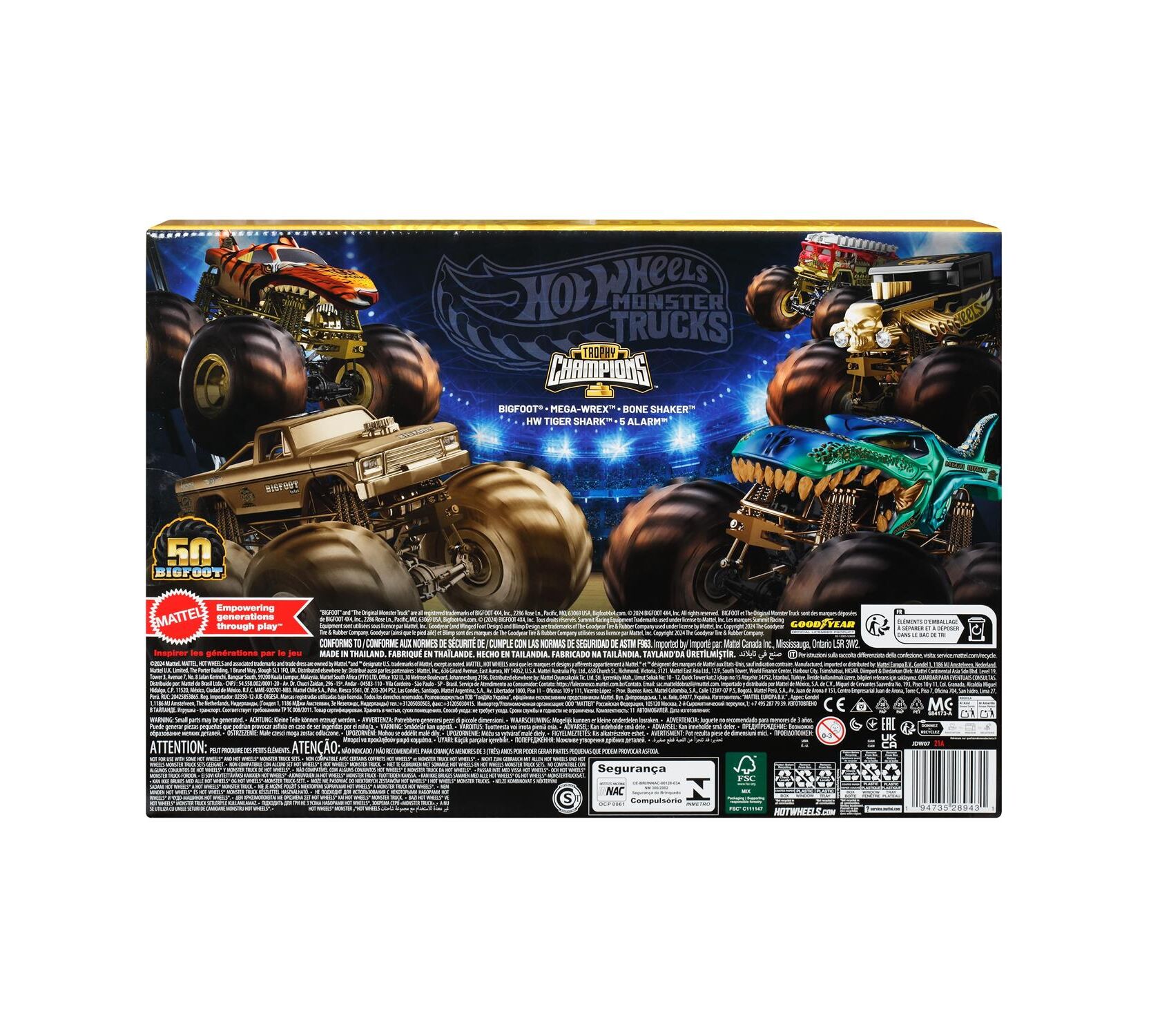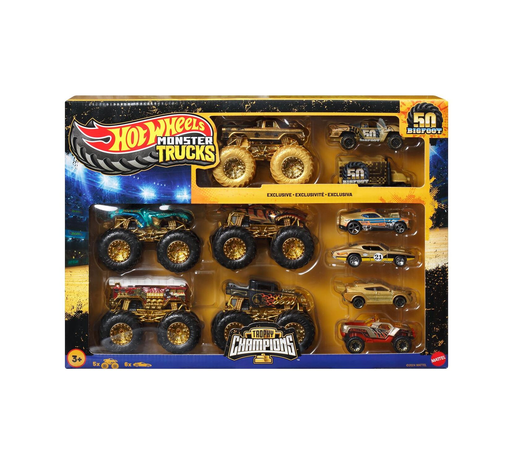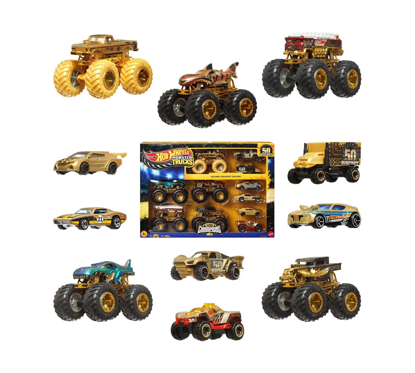 Το σετ Mattel Hot Wheels: Monster Trucks – Bigfoot Trophy Champions Set of 12 (JDW07) είναι μια συλλεκτική έκδοση που γιορτάζει την 50ή επέτειο του πρώτου Monster Truck, του Bigfoot. Αυτό το σετ περιλαμβάνει 5 Monster Trucks και 6 Hot Wheels αυτοκίνητα κλίμακας 1:64, όλα διακοσμημένα με χρυσές λεπτομέρειες για να τιμήσουν το επετειακό γεγονός.