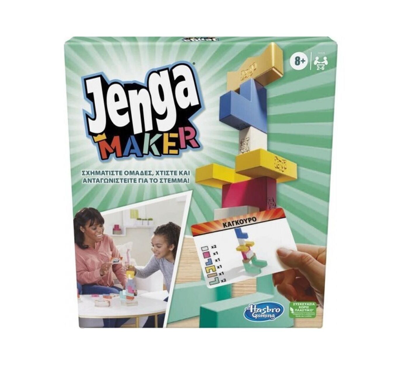 Συνεργαστείτε, κτίστε και τρέξτε να αρπάξετε το στέμμα! Το παιχνίδι Jenga Maker είναι μια διασκεδαστική εκδοχή του κλασικού παιχνιδιού Jenga. Οι παίκτες χωρίζονται σε ομάδες και τρέχουν να χτίσουν το δικό τους αντικείμενο Jenga με τα ξύλινα τουβλάκια. Ένα μέλος της ομάδας περιγράφει τη διάταξη που φαίνεται στην κάρτα και, με βάση μόνο την περιγραφή του, οι υπόλοιποι βιάζονται να χτίσουν και να στέψουν το δημιούργημά τους. Προσέξτε όμως! Αν μια ομάδα χτίσει λάθος το αντικείμενο ή αυτό γκρεμιστεί, τότε πρέπει να ξαναρχίσει από την αρχή. Κερδίζει η πρώτη ομάδα που θα συμπληρώσει σωστά και θα στέψει 3 αντικείμενα!