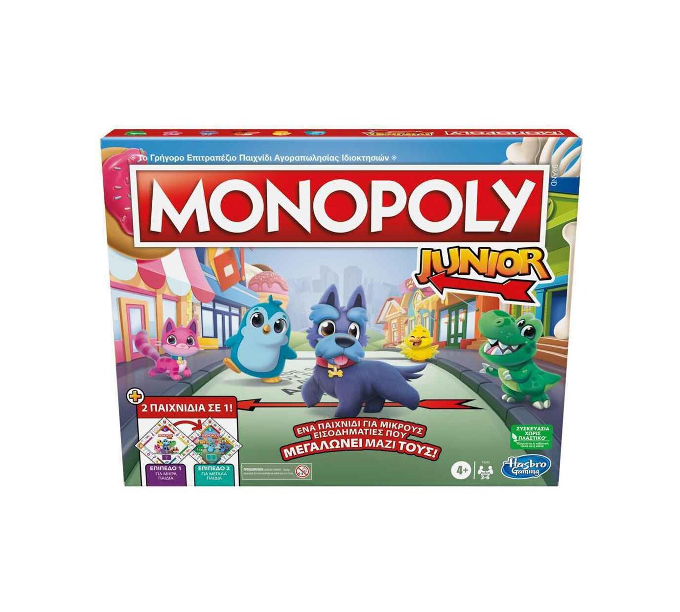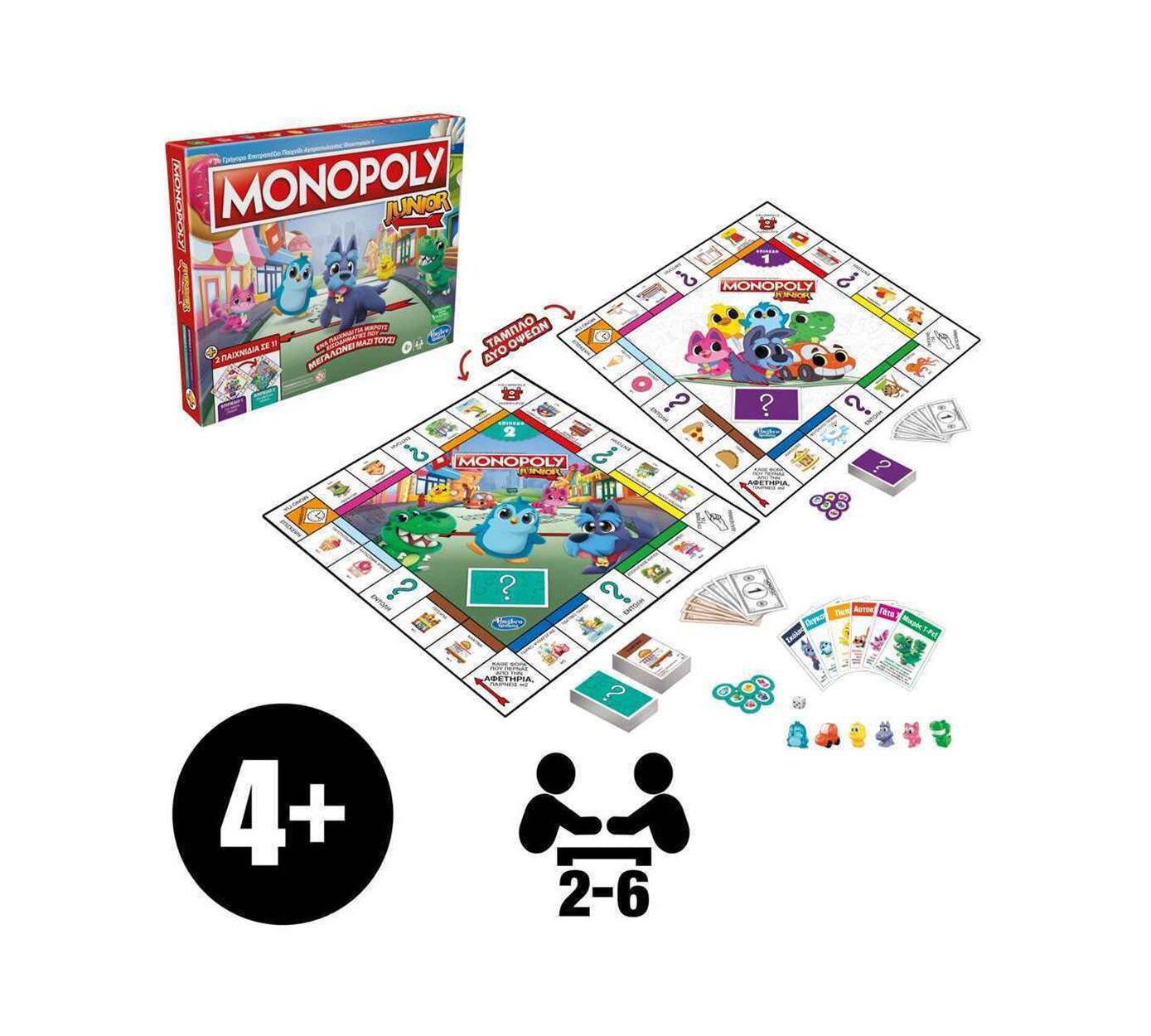 Η Monopoly Junior 2 σε 1 είναι το παιχνίδι που μεγαλώνει μαζί με το παιδί σας! Το ταμπλό διπλής όψεως προσφέρει 2 επίπεδα παιχνιδιού, ώστε οι οικογένειες να μπορούν να αποφασίσουν ποιο επίπεδο είναι καλύτερο για αυτές. Το παιχνίδι Επιπέδου 1 που προτείνεται για ηλικίες 4-5 ετών, βοηθά τα παιδιά να εξασκηθούν στην αντιστοίχιση και τη μέτρηση, καθώς μετρούν κενά, ταιριάζουν εικόνες και αγοράζουν ακίνητα. Ο παίκτης με τα περισσότερα ακίνητα κερδίζει! Είστε έτοιμοι να ανεβείτε ένα επίπεδο;