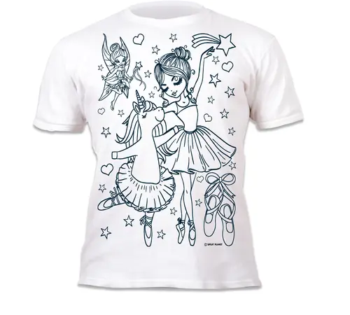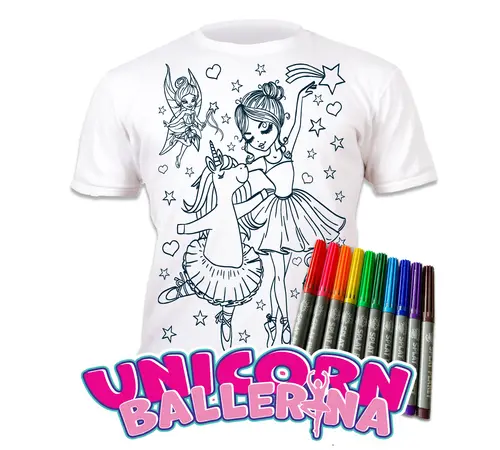 Αυτό το διαδραστικό T-shirt προσφέρει μια δημιουργική δραστηριότητα που δεν τελειώνει ποτέ. Χάρη στους ειδικούς "μαγικούς" μαρκαδόρους που περιλαμβάνονται, οι μικρές καλλιτέχνιδες μπορούν να δώσουν χρώμα στον μονόκερο-μπαλαρίνα και το φόρεμά του, να φορέσουν το μπλουζάκι με περηφάνια και, όταν θελήσουν να δημιουργήσουν μια νέα χορογραφία χρωμάτων, απλώς να το πλύνουν στο πλυντήριο.