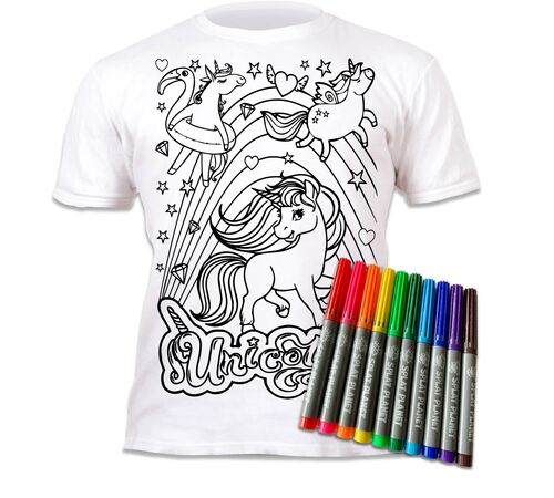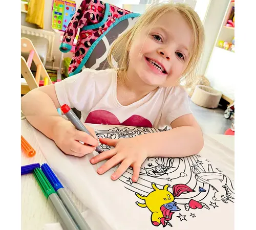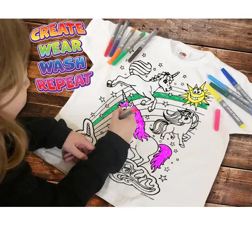 Αυτό το διαδραστικό T-shirt είναι μια δημιουργική δραστηριότητα χωρίς τέλος. Χρησιμοποιώντας τους ειδικούς "μαγικούς" μαρκαδόρους που περιλαμβάνονται στη συσκευασία, τα παιδιά μπορούν να χρωματίσουν τους μονόκερους και τα αστέρια, δημιουργώντας έναν μοναδικό καμβά που μπορούν να φορέσουν με περηφάνια. Όταν θελήσουν να ανανεώσουν το σχέδιο, ένα απλό πλύσιμο στο πλυντήριο αρκεί για να εξαφανιστούν τα χρώματα και να είναι το μπλουζάκι έτοιμο για νέα καλλιτεχνική έμπνευση!