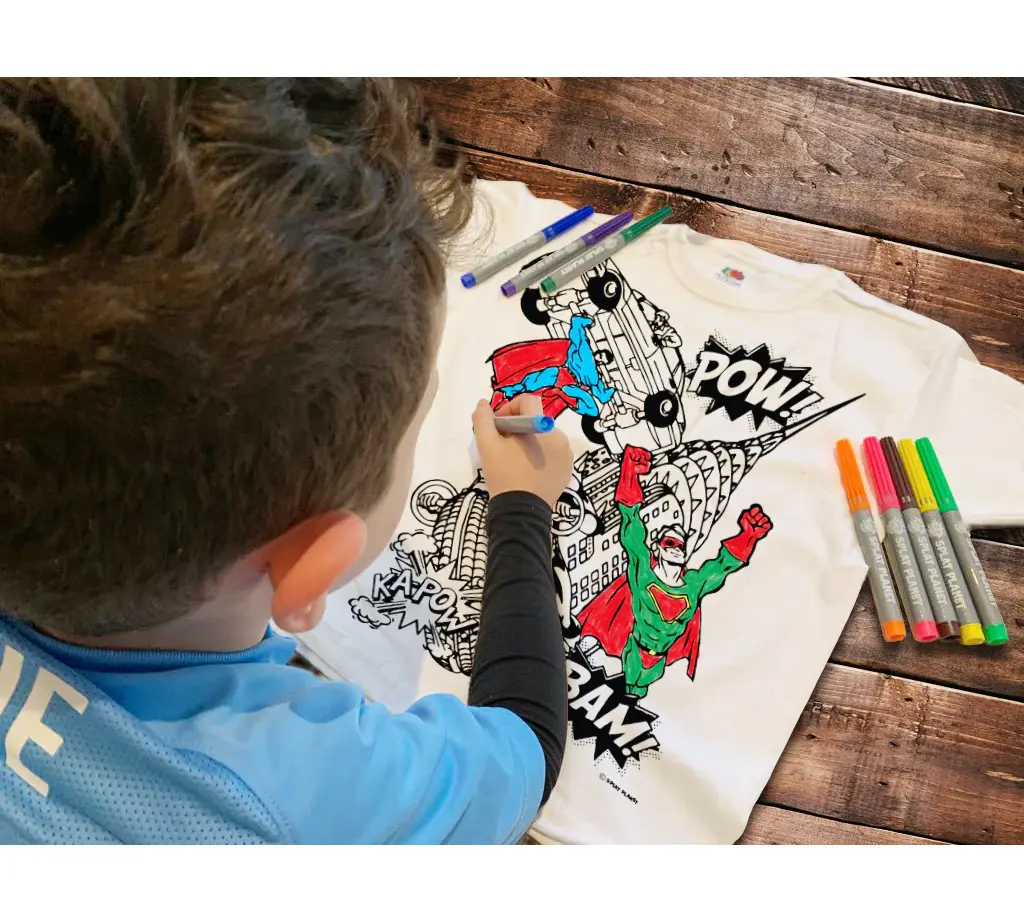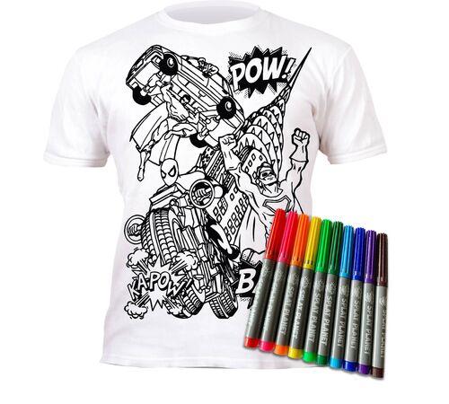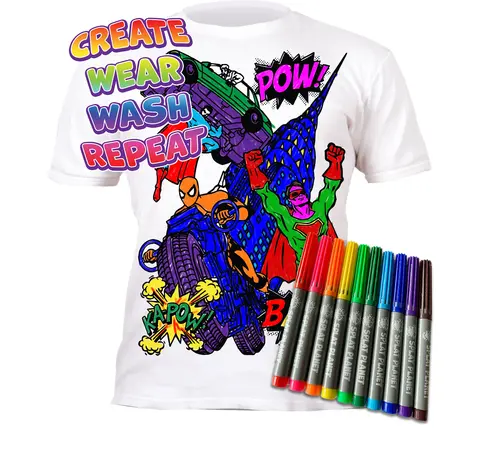 Αφήστε τη δημιουργικότητα του παιδιού σας να απογειωθεί με το μαγικό T-shirt της Splat Planet! Το σχέδιο Super Heroes προσκαλεί τους μικρούς καλλιτέχνες να χρωματίσουν τους αγαπημένους τους ήρωες ακριβώς όπως τους φαντάζονται