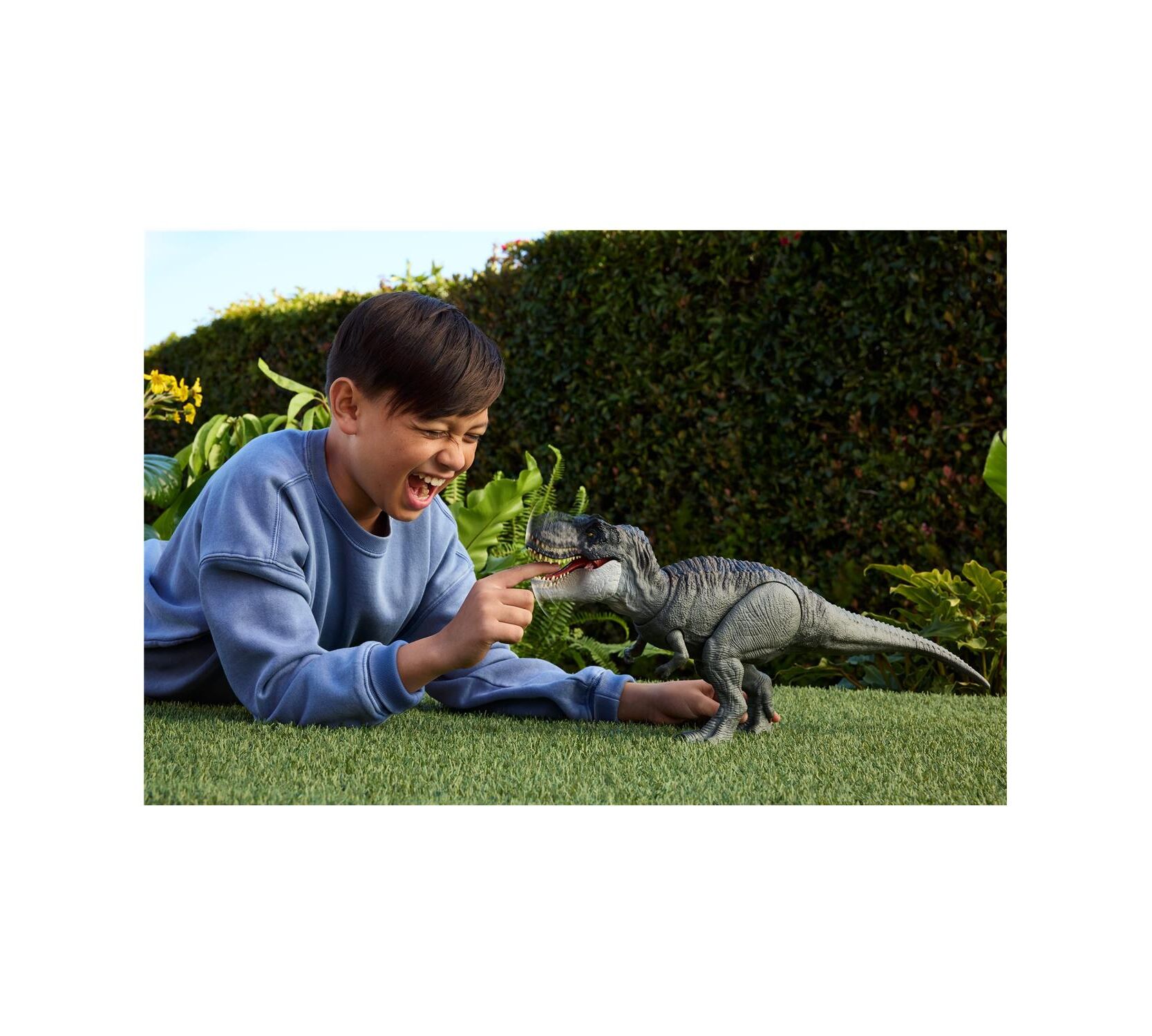 Αυτός ο Τυραννόσαυρος Ρεξ, εμπνευσμένος από το Jurassic World Rebirth, διαθέτει μια συναρπαστική λειτουργία επαναλαμβανόμενης κίνησης με τα σαγόνια του! Όταν η γλώσσα του πιέζεται προς τα κάτω, ακούγεται ένας αρχικός βρυχηθμός. Όταν η γλώσσα παραμένει πατημένη για περισσότερο χρόνο, ενεργοποιείται μια συνεχόμενη δράση 'δαγκώματος' με φώτα και ήχους! Αυτή η λειτουργία προσφέρει συναρπαστικό παιχνίδι δράσης, καθώς ο Τυραννόσαυρος Ρεξ 'δαγκώνει' άλλες φιγούρες δεινοσαύρων! Κουνώντας την ουρά του, το κεφάλι του κινείται πάνω-κάτω ή δεξιά-αριστερά, ενώ τα τεράστια σαγόνια του είναι ανοιχτά! Σαρώστε με μια συμβατή smart συσκευή (Android ή iOS - δεν περιλαμβάνεται) τον κωδικό στο πόδι του δεινοσαύρου στη δωρεάν εφαρμογή Jurassic World Play, για να ξεκλειδώσετε μια ψηφιακή έκδοσή του και να παίξετε το συναρπαστικό παιχνίδι αγώνων με διάφορα οχήματα σε ξηρά, αέρα και θάλασσα. Ιδανικό δώρο για παιδιά 4 ετών και άνω που αγαπούν τους δεινόσαυρους.