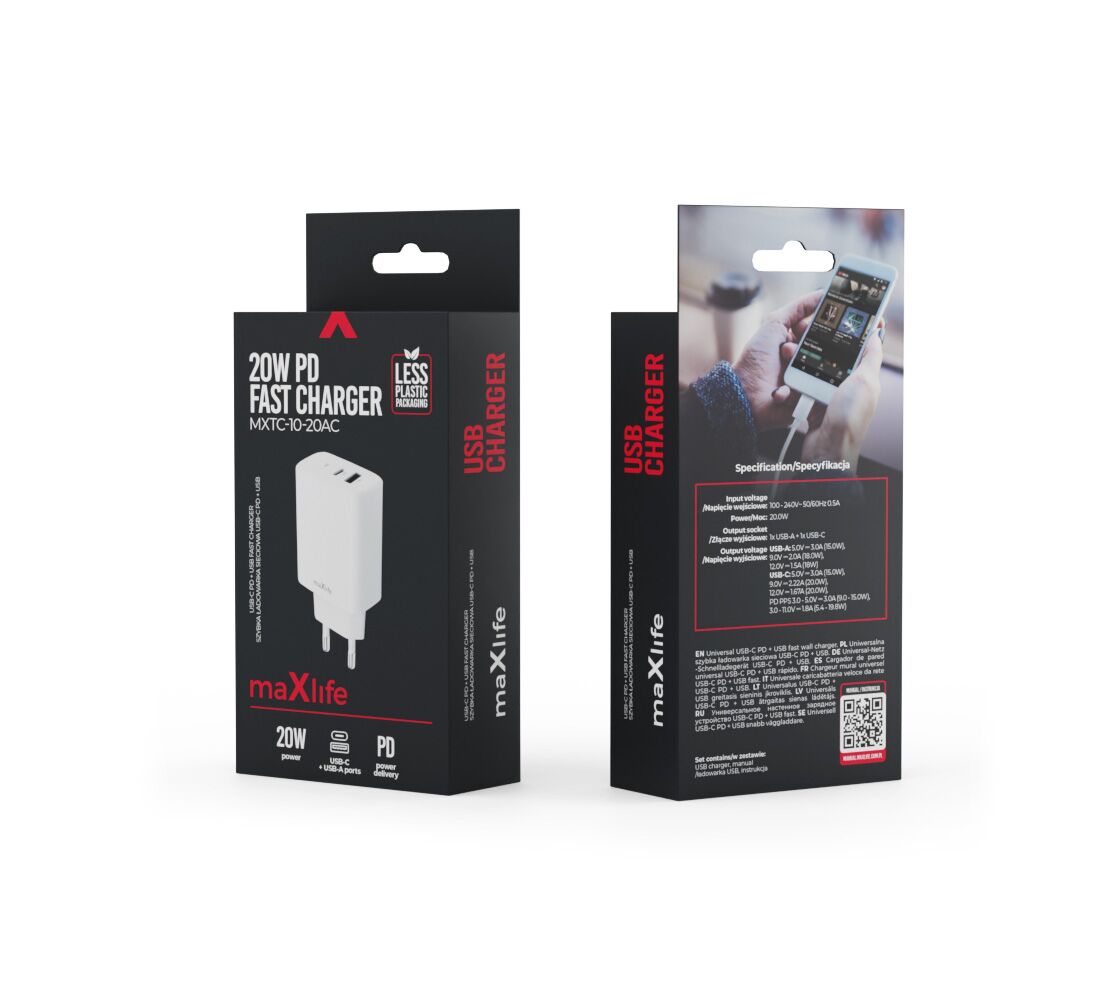 Ο φορτιστής τοίχου Maxlife MXTC-10 είναι μια συμπαγής και κομψή συσκευή, ιδανική για τη γρήγορη και ασφαλή φόρτιση του smartphone σας και άλλων μικρών ηλεκτρονικών συσκευών. Με μέγιστη ισχύ 20W και υποστήριξη για τα πιο σύγχρονα πρωτόκολλα γρήγορης φόρτισης, αποτελεί μια αξιόπιστη λύση για την καθημερινότητά σας.