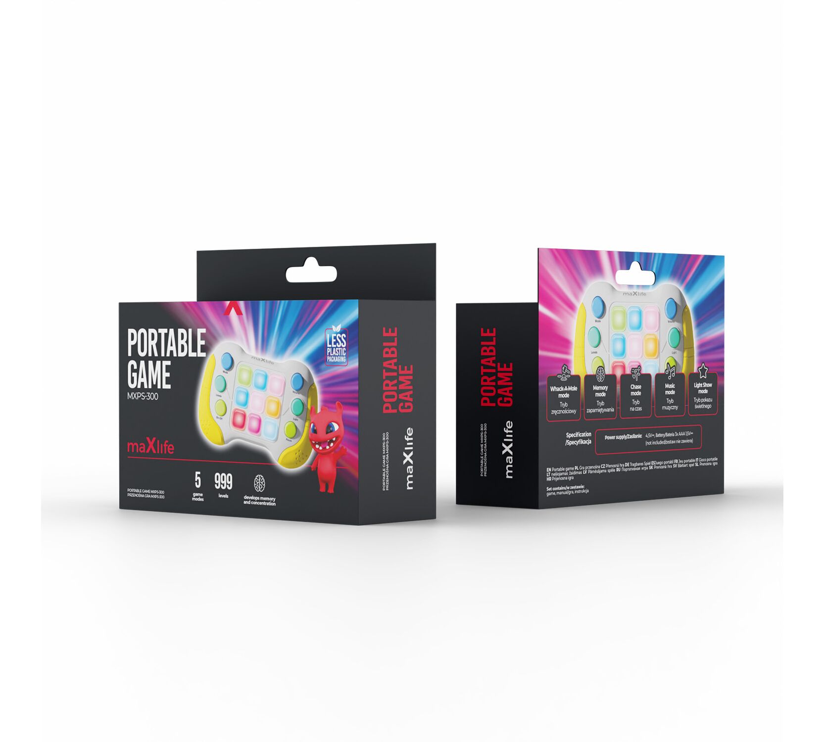 Το Maxlife MXPS-300 είναι ένα φορητό παιχνίδι dexterity Pop It με δυναμικό χαρακτήρα. Επιτρέπει την ανάπτυξη ανακλαστικών, μνήμης και συντονισμού χεριού-μάτι, προσφέροντας ελκυστικό παιχνίδι σε κάθε ελεύθερη στιγμή. Με το συμπαγές μέγεθός του, χωράει στο χέρι σας και είναι έτοιμο για παιχνίδι οπουδήποτε, στο σπίτι, εν κινήσει, στο σχολείο ή στο γραφείο. Η συσκευή προσφέρει ξεχωριστές λειτουργίες: Whack-a-Mole, Memory Mode, Music Mode και Chase Mode. Κάθε μία παρέχει έναν διαφορετικό τύπο πρόκλησης, από την απομνημόνευση ακολουθιών φωτός μέχρι την αντίδραση σε μεταβαλλόμενες ταχύτητες παιχνιδιού. Οι ενσωματωμένοι επίπεδοι δυσκολίας σας επιτρέπουν να προσαρμόσετε τον ρυθμό του παιχνιδιού στην ηλικία και την εμπειρία του παίκτη.