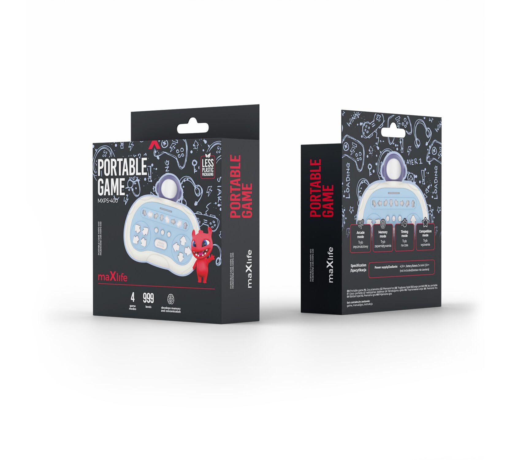 Το Maxlife MXPS-400 είναι ένα ηλεκτρονικό παιχνίδι δεξιοτήτων με συμπαγή σχεδίαση και δυναμικούς μηχανισμούς. Η συσκευή υποστηρίζει την ανάπτυξη των αντανακλαστικών, της συγκέντρωσης και του συντονισμού χεριού-ματιού, προσφέροντας ταυτόχρονα ελκυστική παιχνιδιότητα σε τέσσερις διαφοροποιημένες λειτουργίες. Χάρη στην φορητή της μορφή, το παιχνίδι είναι κατάλληλο τόσο για το σπίτι όσο και για ταξίδια. Ένα βασικό χαρακτηριστικό του μοντέλου MXPS-400 είναι το εντυπωσιακό κεφάλι αστροναύτη που βρίσκεται στην κορυφή της θήκης. Αυτός ο στοιχείο τραβάει την προσοχή και δίνει στη συσκευή μια μοντέρνα, παιδικά-φουτουριστική εμφάνιση. Οι φωτεινές αποχρώσεις και το εργονομικό σχήμα εξασφαλίζουν ότι το παιχνίδι εφαρμόζει καλά στα χέρια και είναι αισθητικά ελκυστικό για τους νεότερους χρήστες.