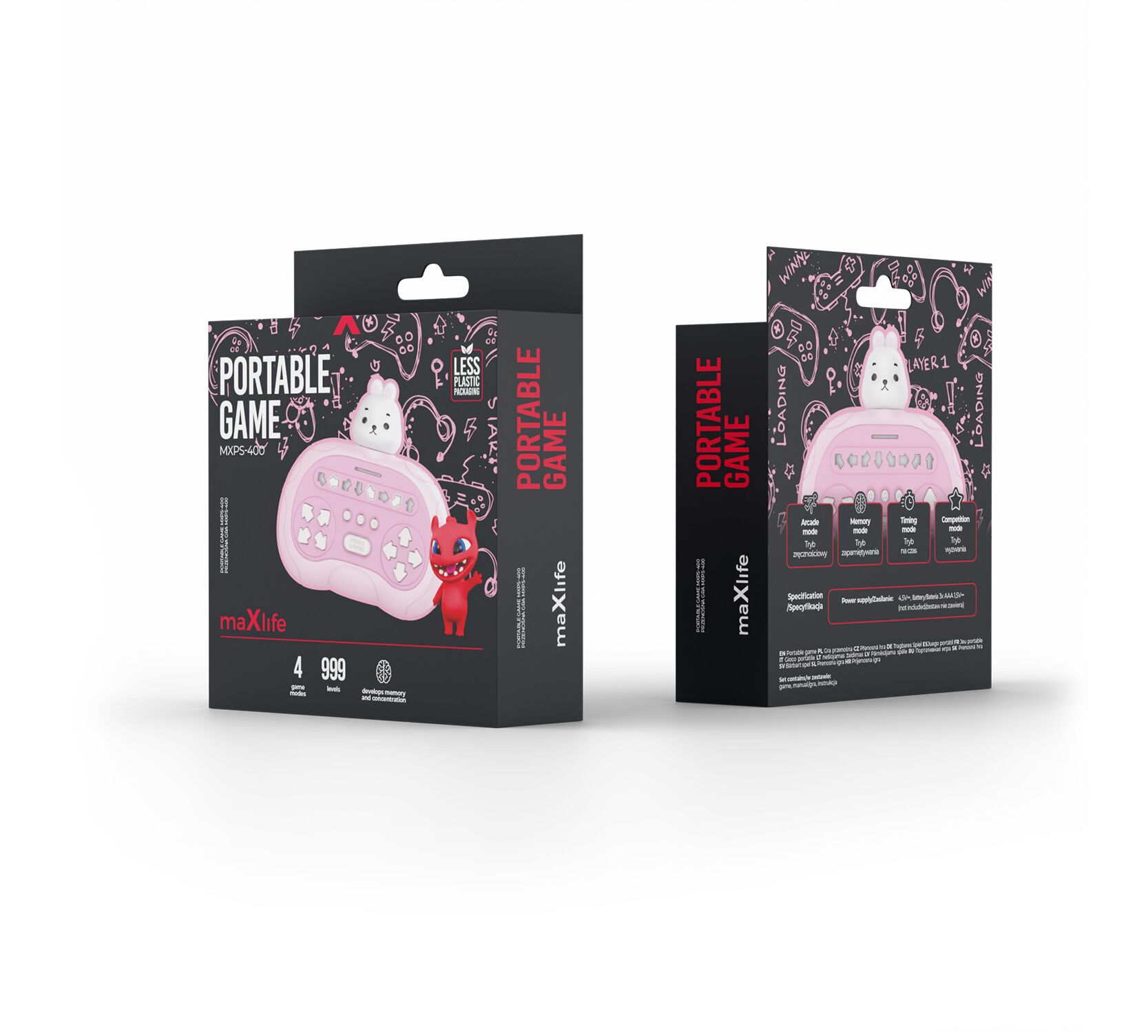 Το Maxlife MXPS-400 είναι ένα συμπαγές παιχνίδι δεξιοτήτων σχεδιασμένο για ενεργό και αναπτυξιακή διασκέδαση. Η συσκευή υποστηρίζει τα αντανακλαστικά, τη συγκέντρωση και τον συντονισμό χεριού-ματιού μέσω δυναμικού παιχνιδιού σε τέσσερις λειτουργίες με διακυμάνσεις στο επίπεδο δυσκολίας. Ο πρακτικός σχεδιασμός της επιτρέπει να παίζεται οπουδήποτε – στο σπίτι, εν κινήσει, ή κατά τη διάρκεια διαλλειμάτων στο σχολείο. Η ροζ θήκη ενισχύεται με μια διακριτική μυτούλα κουνελιού που δίνει στη συσκευή έναν φιλικό, παιχνιδιάρικο χαρακτήρα. Γραφικά στοιχεία και στρογγυλεμένες γραμμές κάνουν το προϊόν οπτικά ελκυστικό και ιδιαίτερα αγαπητό από τα μικρότερα παιδιά. Η συμπαγής μορφή του ταιριάζει τέλεια στο χέρι, αυξάνοντας την ευκολία χρήσης.