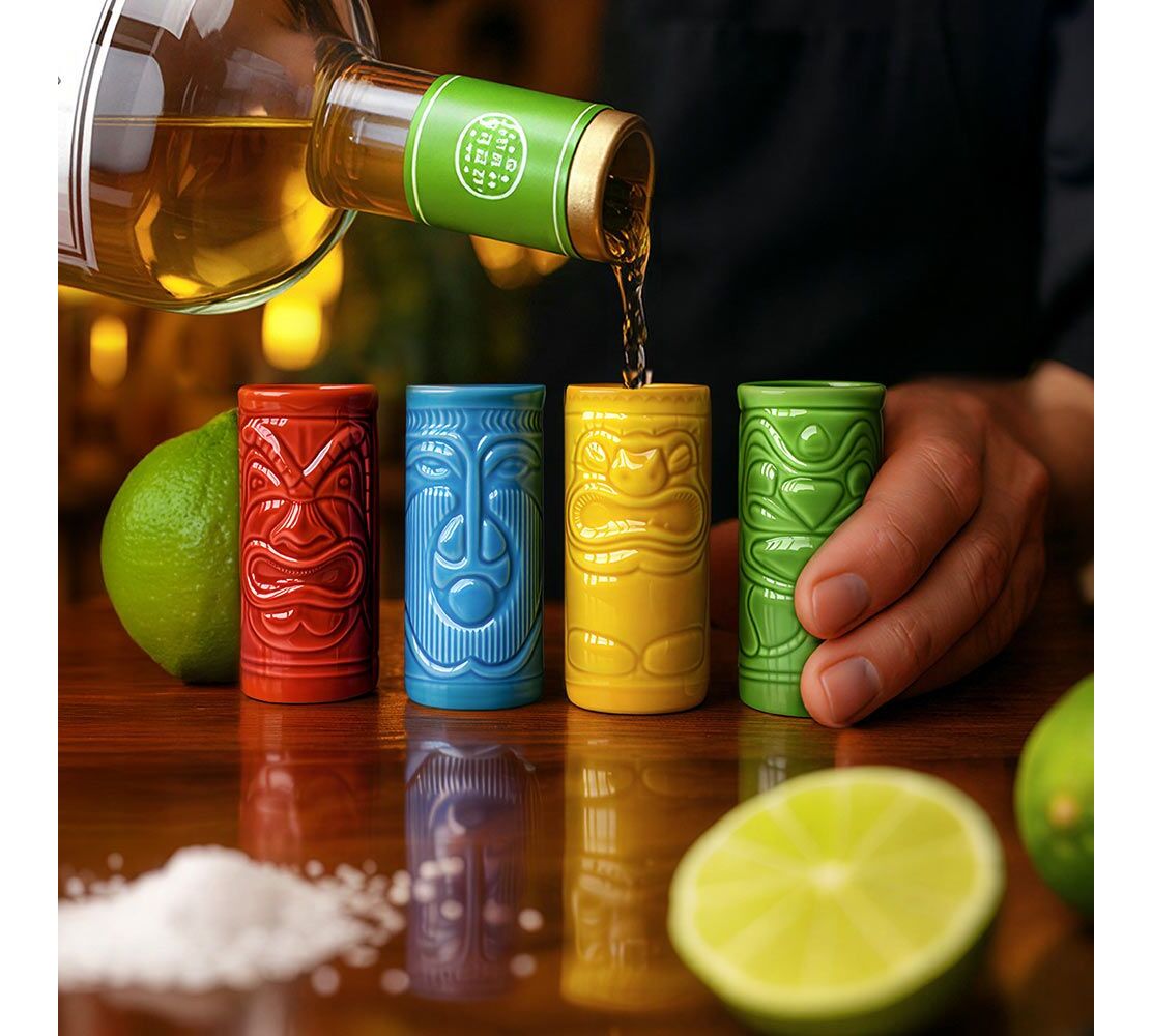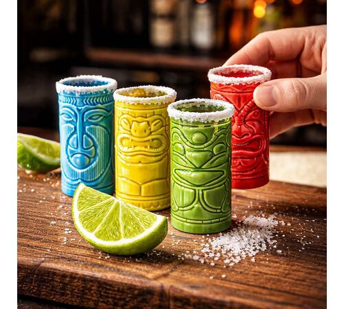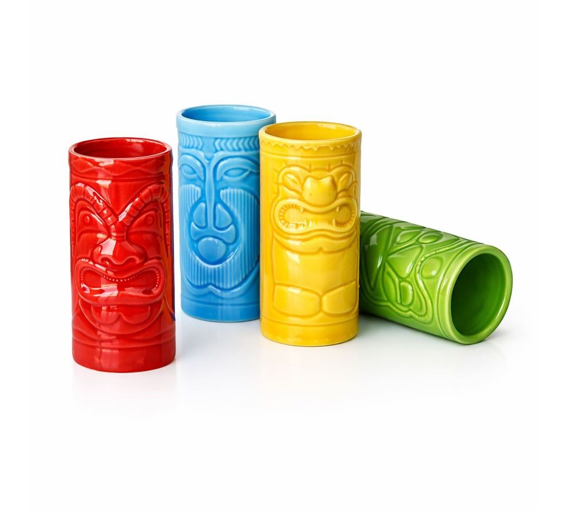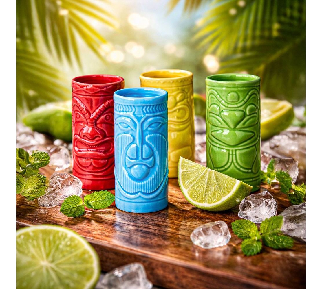 Το σετ περιλαμβάνει 4 σφηνάκια, το καθένα με τον δικό του μοναδικό "Tiki" σχεδιασμό που απεικονίζει τα χαρακτηριστικά τοτέμ της Χαβάης. Είναι κατασκευασμένα από υψηλής ποιότητας, ανθεκτικό κεραμικό υλικό, με ανάγλυφες λεπτομέρειες και γυαλιστερό φινίρισμα που τα κάνει να ξεχωρίζουν. Εκτός από την εντυπωσιακή τους εμφάνιση, είναι και εξαιρετικά πρακτικά, καθώς μπαίνουν άφοβα στο πλυντήριο πιάτων για εύκολο καθάρισμα μετά το πάρτι.
