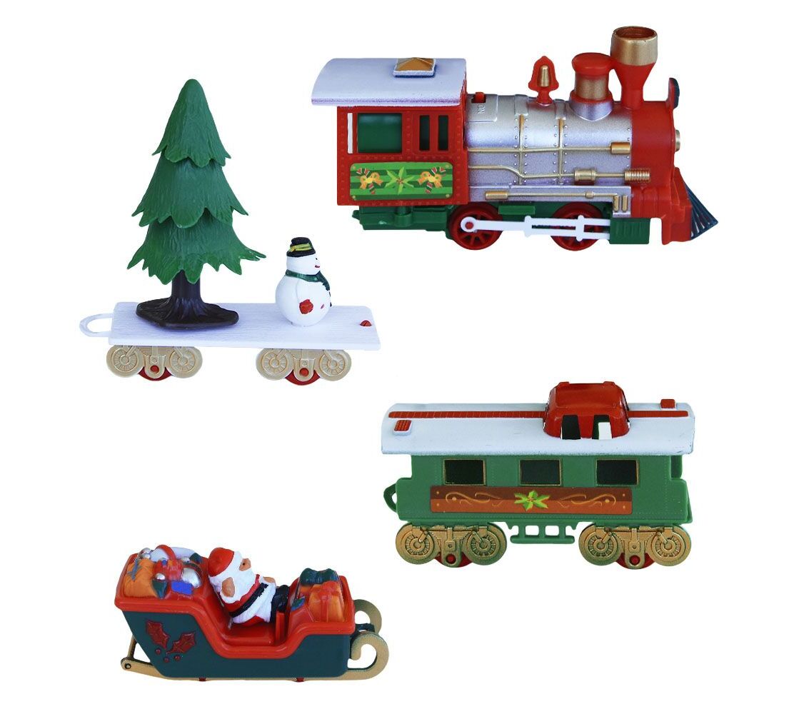 - Περιλαμβάνει 31 κομμάτια: ράγες, δοκούς στήριξης, 2 βαγόνια, Άγιο Βασίλη με έλκηθρο, χιονάνθρωπο, και χριστουγεννιάτικο δέντρο