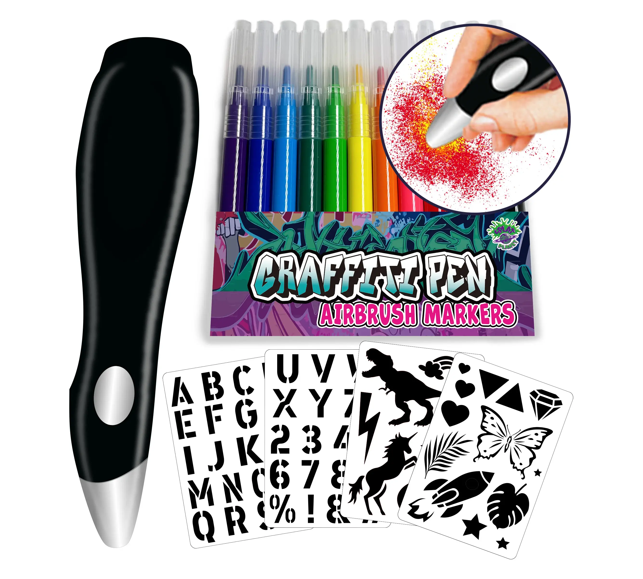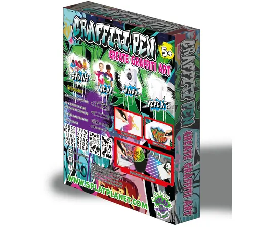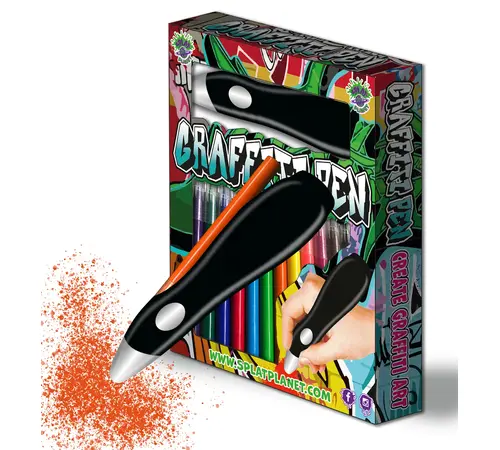 Ανακαλύψτε τον μαγικό κόσμο του street art και του γκράφιτι με το καινοτόμο Graffiti Pen της Splat Planet! Αυτό το ηλεκτρικό στυλό - αερογράφος (electric airbrush) μετατρέπει την απλή ζωγραφική σε μια πραγματική καλλιτεχνική εμπειρία, δίνοντας σε παιδιά και ενήλικες τη δυνατότητα να εξασκήσουν τις ικανότητές τους στο γκράφιτι, απόλυτα με ασφάλεια και χωρίς καμία ακαταστασία.