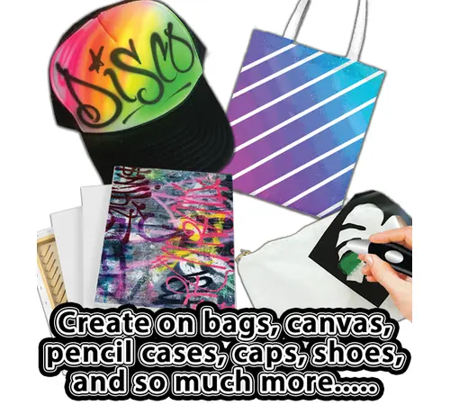 Τοποθετήστε έναν από τους 12 ειδικούς μαρκαδόρους στο στυλό και ψεκάστε χρώμα πάνω σε μπλουζάκια, καπέλα, παπούτσια, κασετίνες, χαρτί ή καμβάδες! Το πιο εντυπωσιακό; Οι μαρκαδόροι είναι απόλυτα πλενόμενοι, μη τοξικοί και βιοδιασπώμενοι. Μπορείτε να διακοσμήσετε ένα T-shirt, να το φορέσετε, να το πλύνετε στο πλυντήριο (τα χρώματα εξαφανίζονται μαγικά χωρίς να βάφουν τα υπόλοιπα ρούχα) και να δημιουργήσετε ένα νέο σχέδιο από την αρχή (Spray -> Wear -> Wash -> Repeat)!