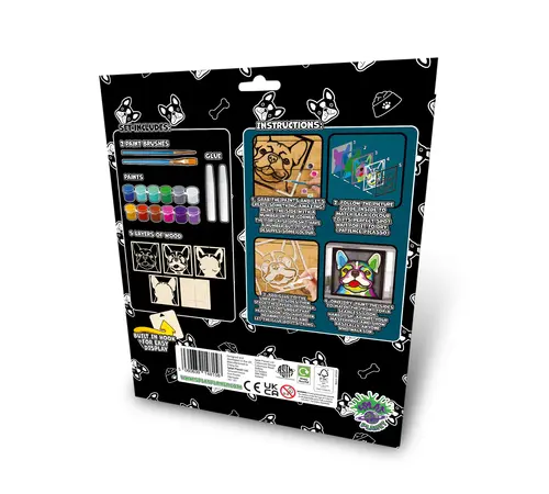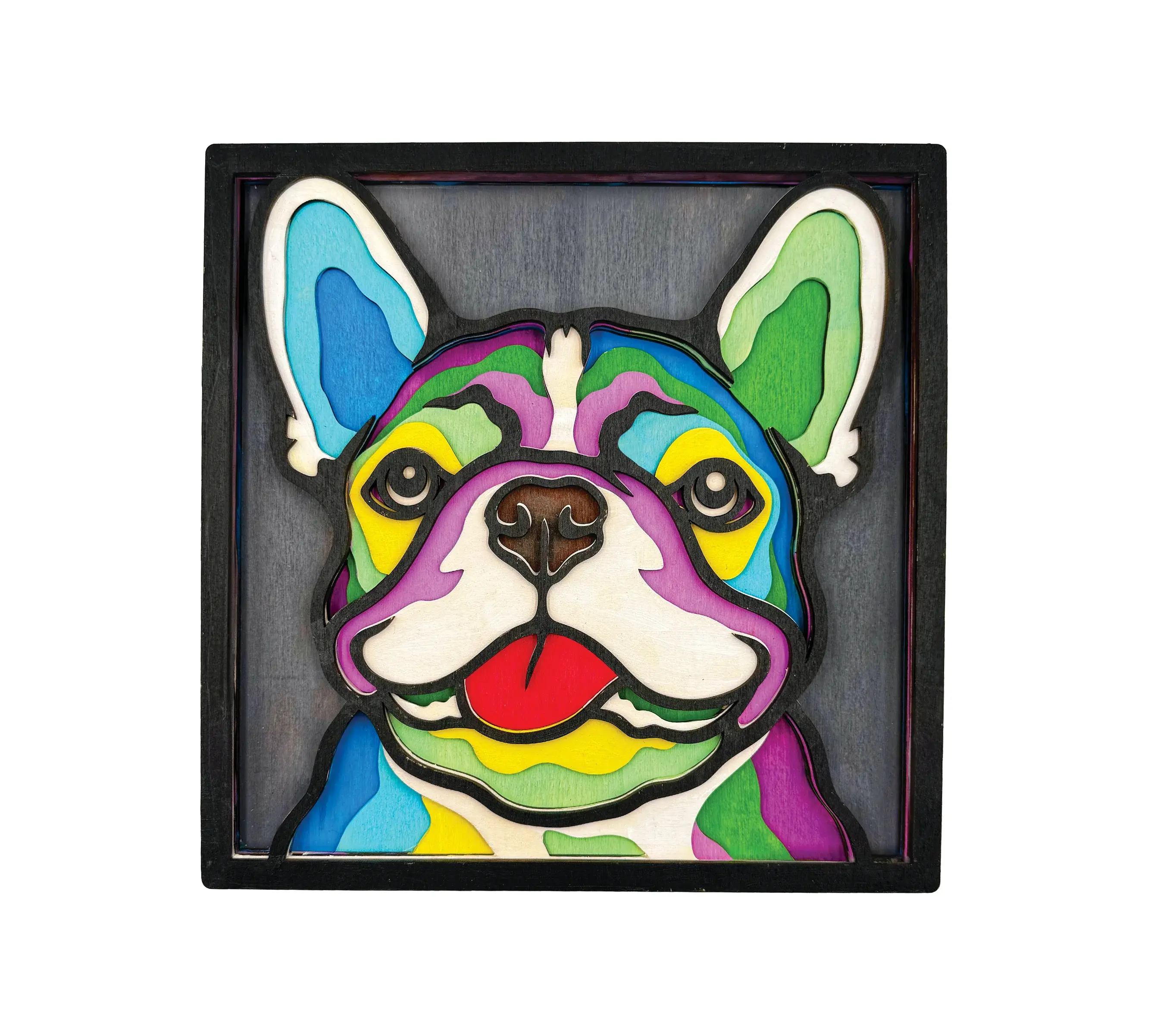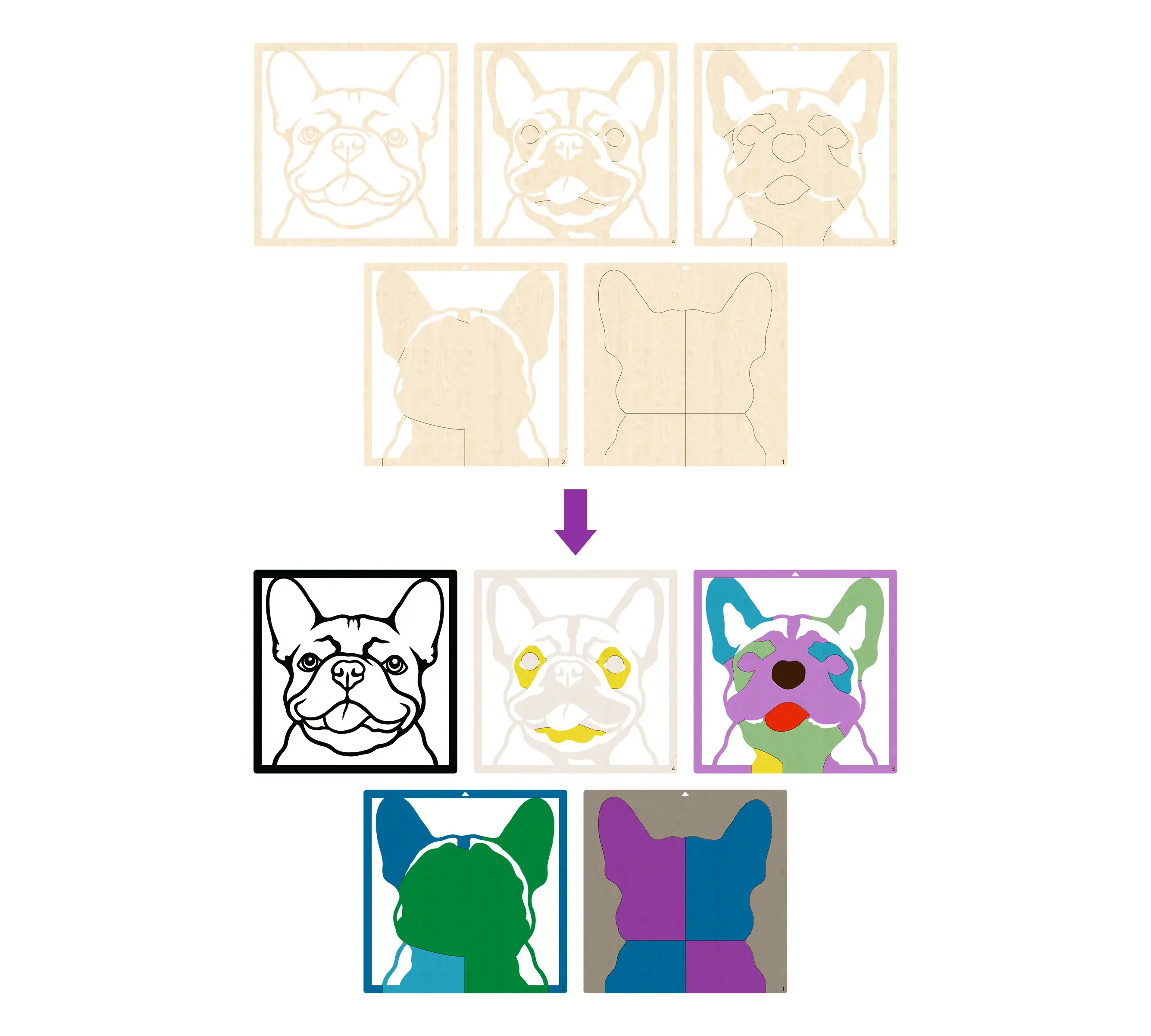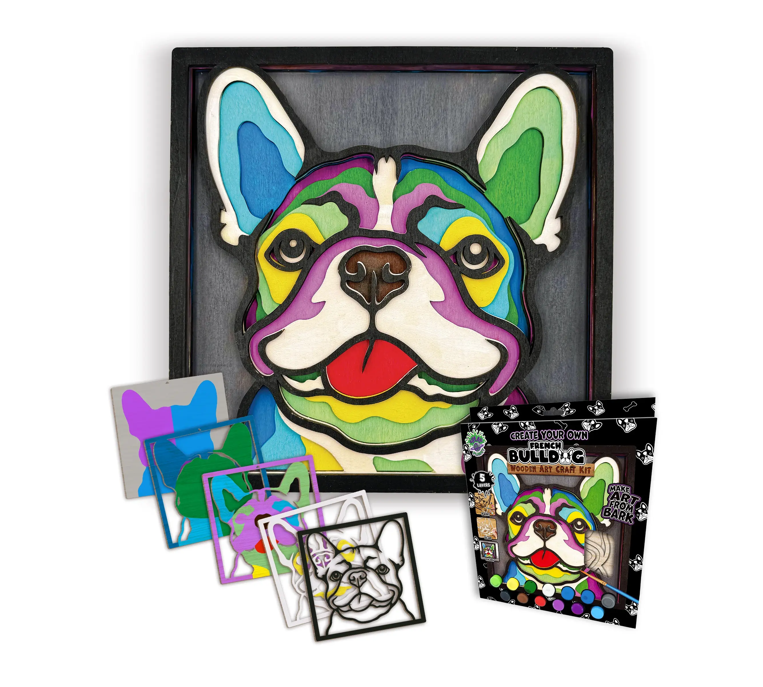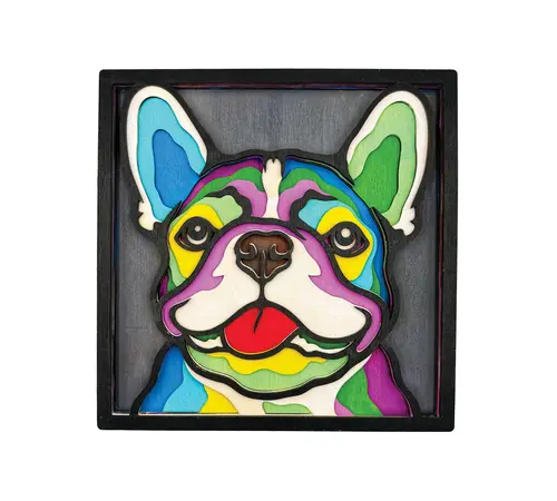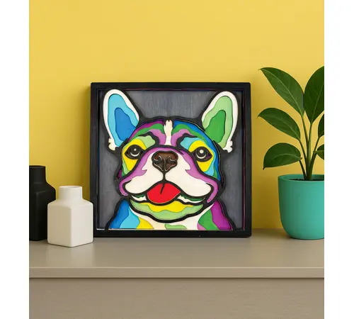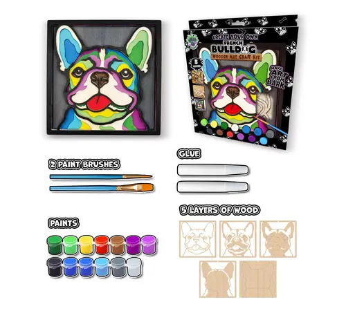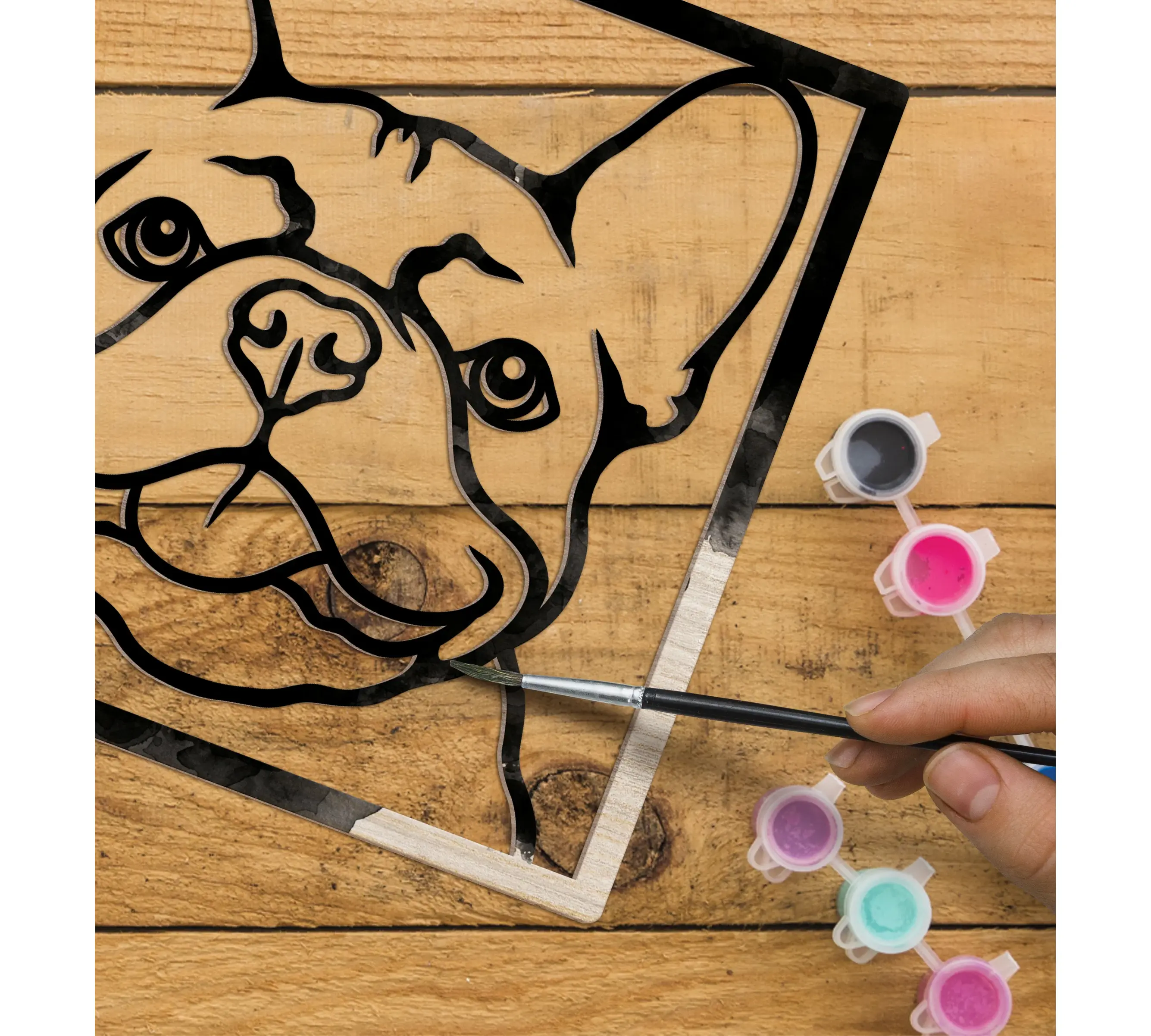 Αντί για έναν απλό, επίπεδο καμβά, αυτό το σετ περιλαμβάνει προ-κομμένα, ξύλινα επίπεδα (layers) που, όταν ενωθούν, δημιουργούν το υπέροχο πρόσωπο ενός Γαλλικού Μπουλντόγκ με βάθος και υφή (3D εφέ). Η διαδικασία είναι διασκεδαστική, χαλαρωτική και απλή: αρχικά χρωματίζετε κάθε ξύλινο επίπεδο ξεχωριστά με τα χρώματα που περιλαμβάνονται, και στη συνέχεια τα κολλάτε το ένα πάνω στο άλλο ακολουθώντας τις οδηγίες.