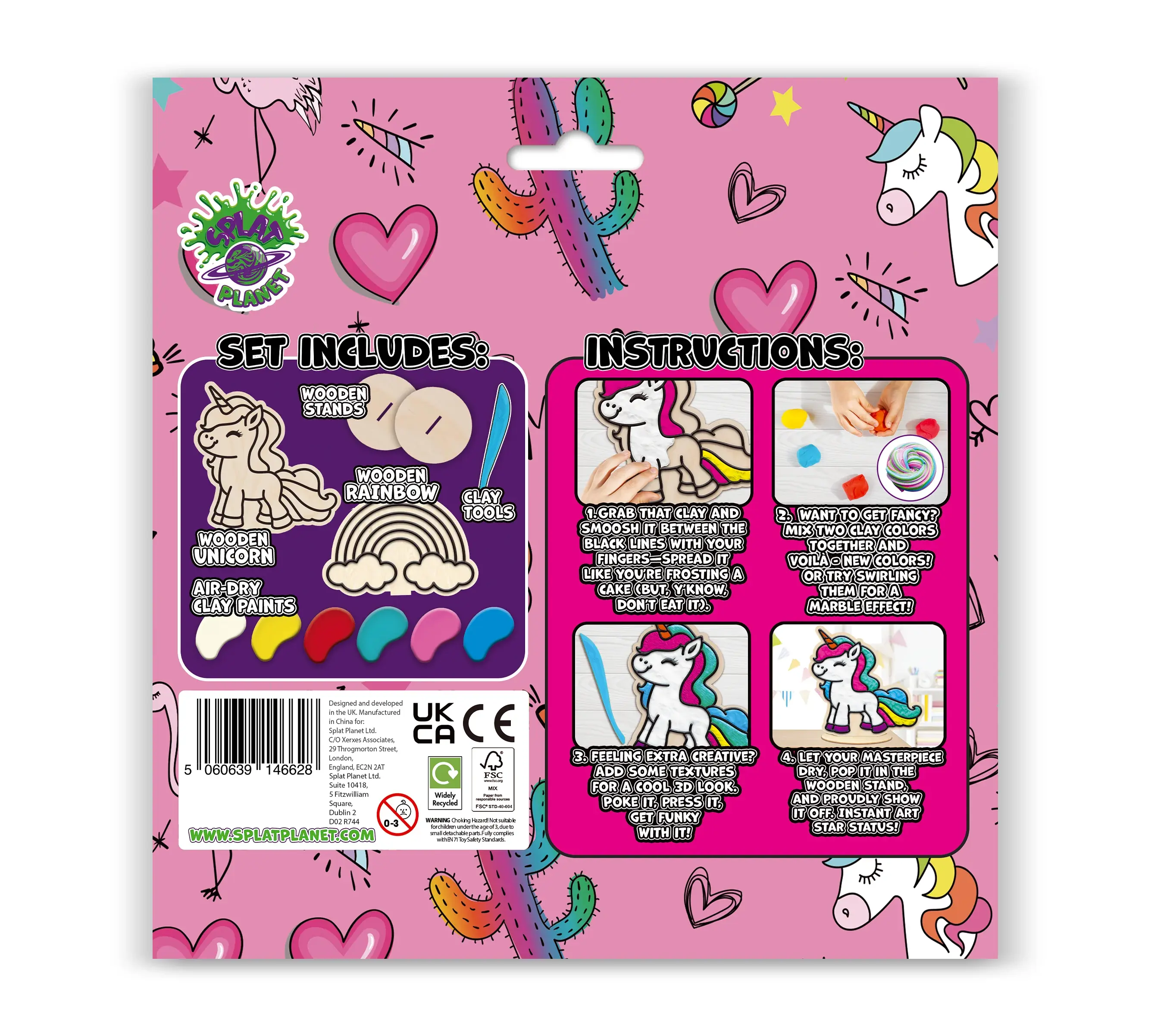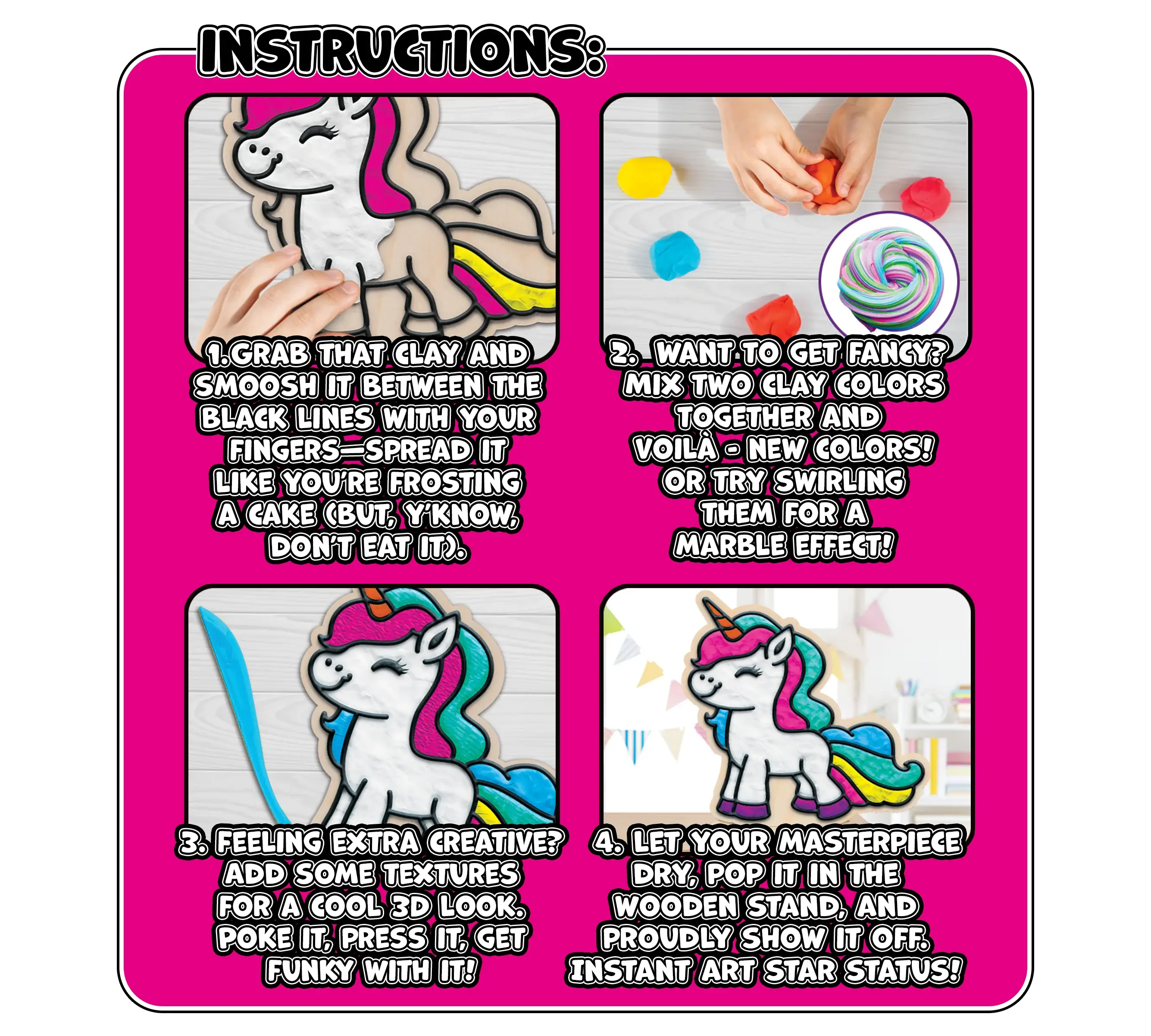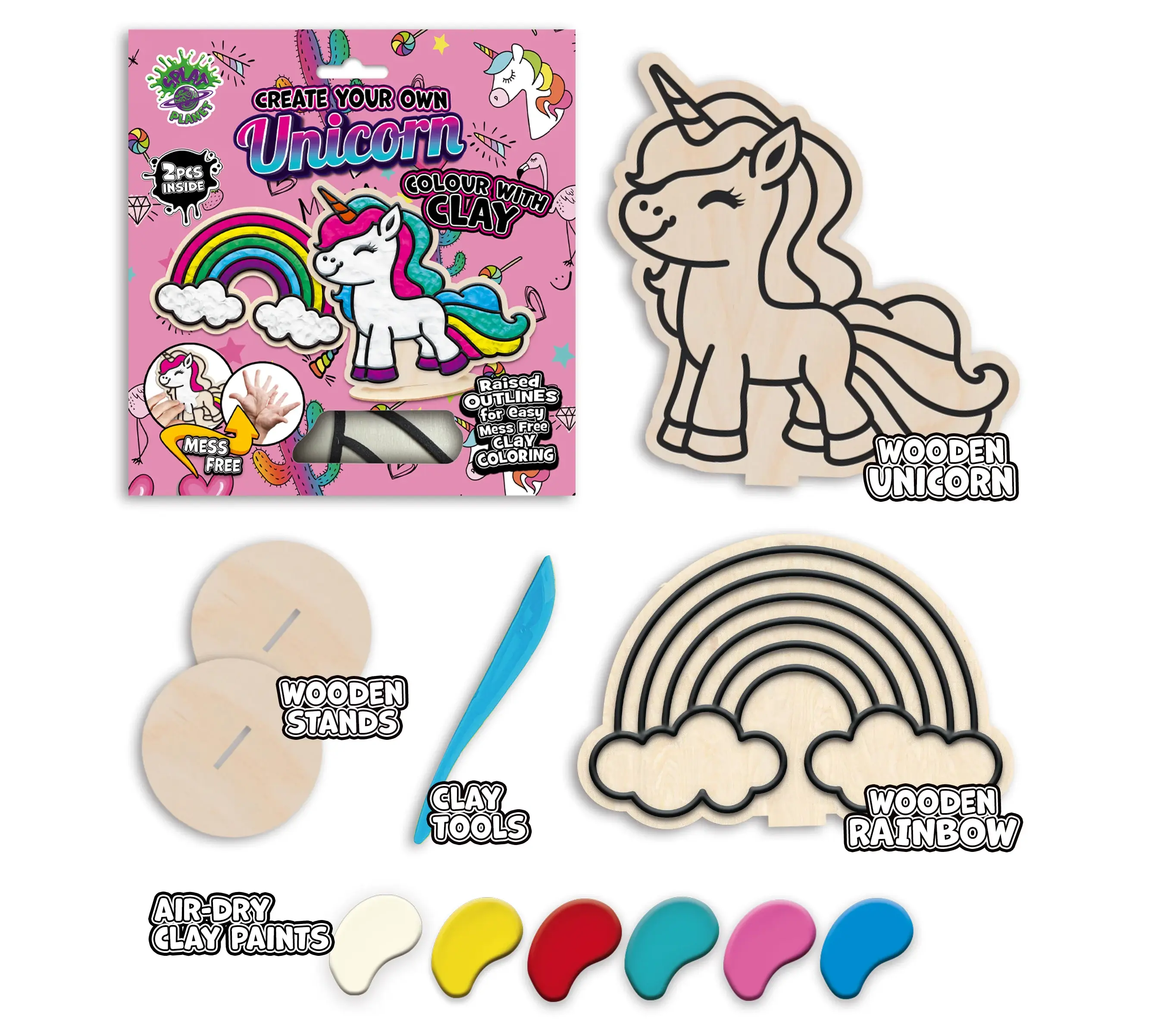 - Περιεχόμενα Συσκευασίας: 2 ξύλινα σχέδια μονόκερων, σακουλάκια με χρωματιστό πηλό, εργαλεία διαμόρφωσης, ξύλινες βάσεις (stands), οδηγίες