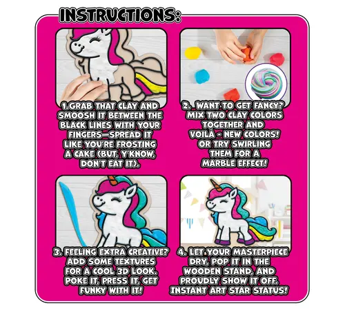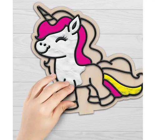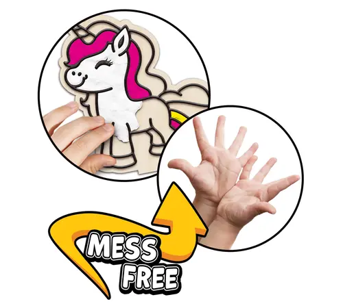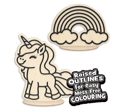 Χωρίς λεκέδες, χωρίς νερά και χωρίς πινέλα! Με αυτό το κιτ, τα παιδιά μπορούν να γεμίσουν τα υπερυψωμένα περιγράμματα σε δύο υπέροχα ξύλινα σχέδια μονόκερων, χρησιμοποιώντας χρωματιστό πηλό. Η διαδικασία απλώματος και διαμόρφωσης του πηλού ενισχύει τη λεπτή κινητικότητα, ενθαρρύνει τη συγκέντρωση και προσφέρει ατελείωτες ώρες δημιουργικής διασκέδασης. Μόλις ο πηλός στεγνώσει, το έργο αποκτά μια εντυπωσιακή, ανάγλυφη (3D) υφή. Χάρη στις ξύλινες βάσεις που περιλαμβάνονται, οι δημιουργίες τους μετατρέπονται σε πανέμορφα διακοσμητικά για το δωμάτιό τους.