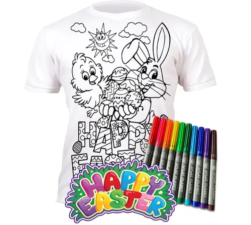 Το σετ περιλαμβάνει ένα λευκό μπλουζάκι από 100% βαμβάκι με ένα όμορφο πασχαλινό σχέδιο και 10 "μαγικούς" μαρκαδόρους σε ζωηρά χρώματα. Τα παιδιά μπορούν να το χρωματίσουν όπως ακριβώς φαντάζονται, να το φορέσουν και να το δείξουν με καμάρι στους φίλους τους. Το καλύτερο μέρος; Μετά το παιχνίδι, απλώς βάλτε το στο πλυντήριο! Τα χρώματα (μη τοξικά και 100% πλενόμενα) εξαφανίζονται εντελώς, αφήνοντας το μπλουζάκι καθαρό και έτοιμο να ζωγραφιστεί από την αρχή!