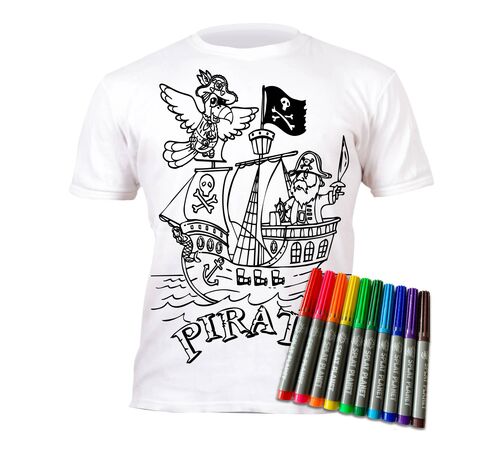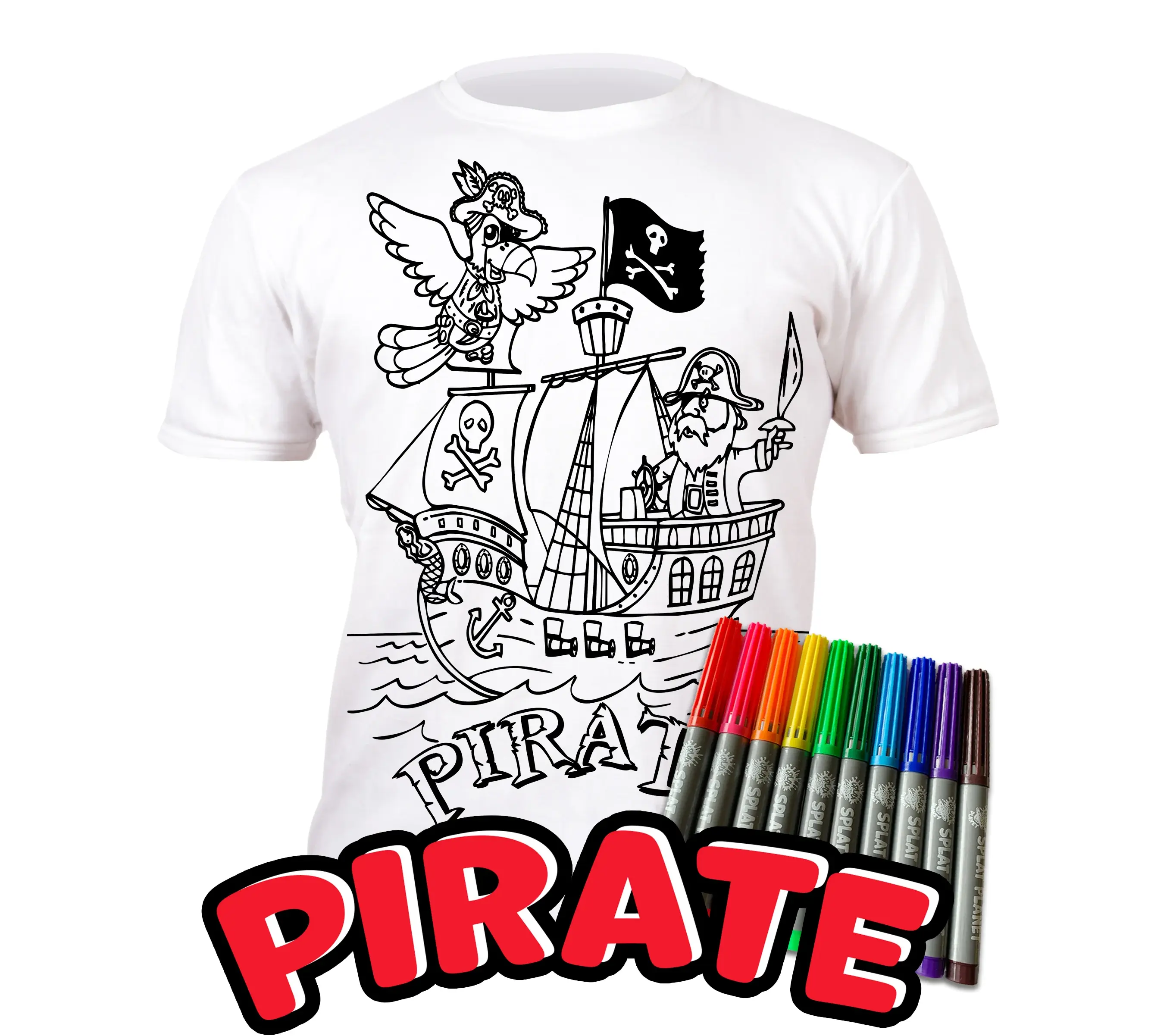 Αυτό το διαδραστικό μπλουζάκι επιτρέπει στα παιδιά να γίνουν οι δημιουργοί του δικού τους πειρατικού κόσμου. Με τους ειδικούς "μαγικούς" μαρκαδόρους που περιλαμβάνονται, μπορούν να χρωματίσουν το πλοίο, τον πειρατή και το χάρτη του θησαυρού, δημιουργώντας ένα μοναδικό ρούχο. Όταν η αποστολή ολοκληρωθεί και έρθει η ώρα για μια νέα περιπέτεια, μια απλή πλύση στο πλυντήριο αρκεί για να καθαρίσει το μπλουζάκι και να ξεκινήσει η διασκέδαση από την αρχή!