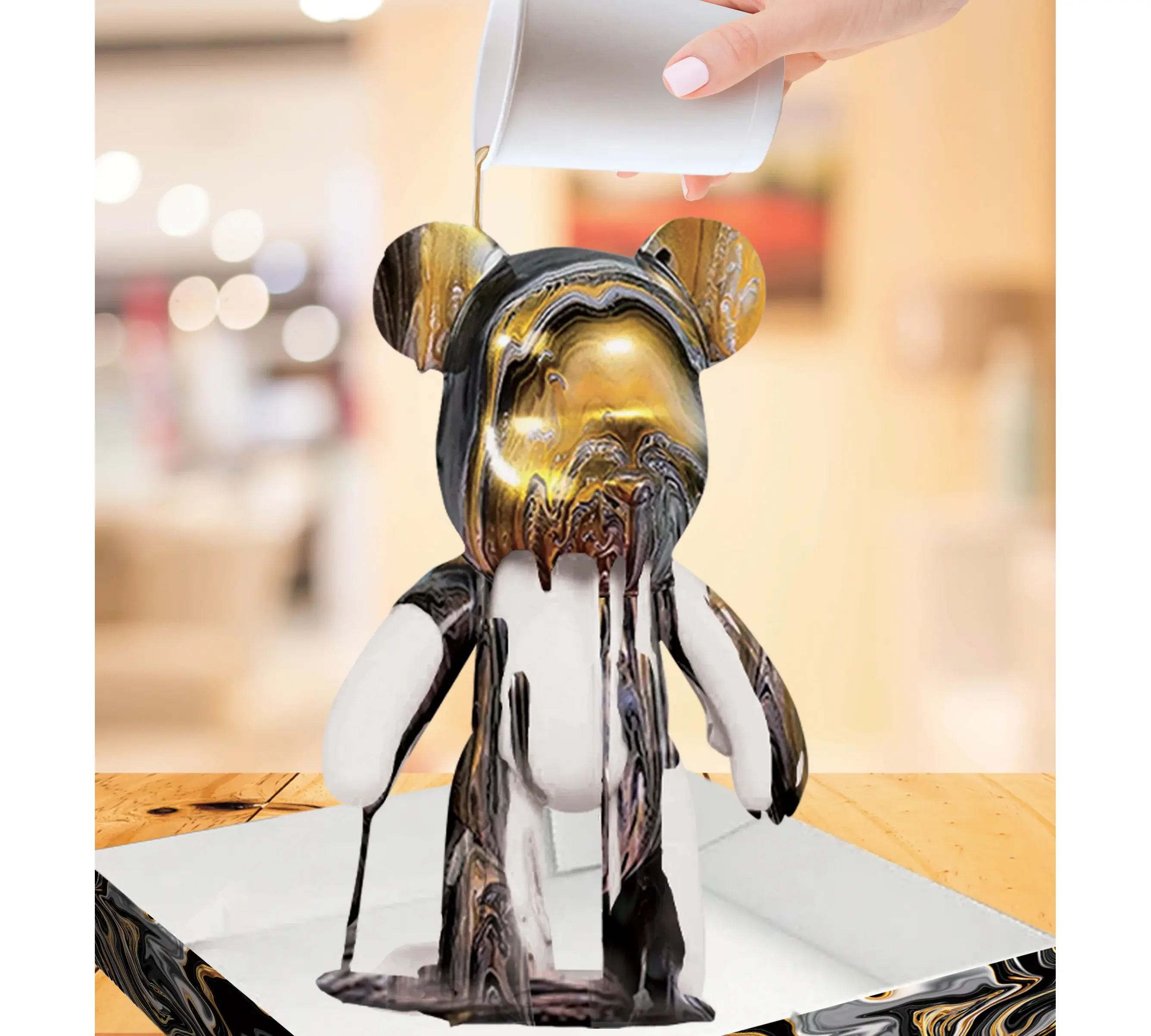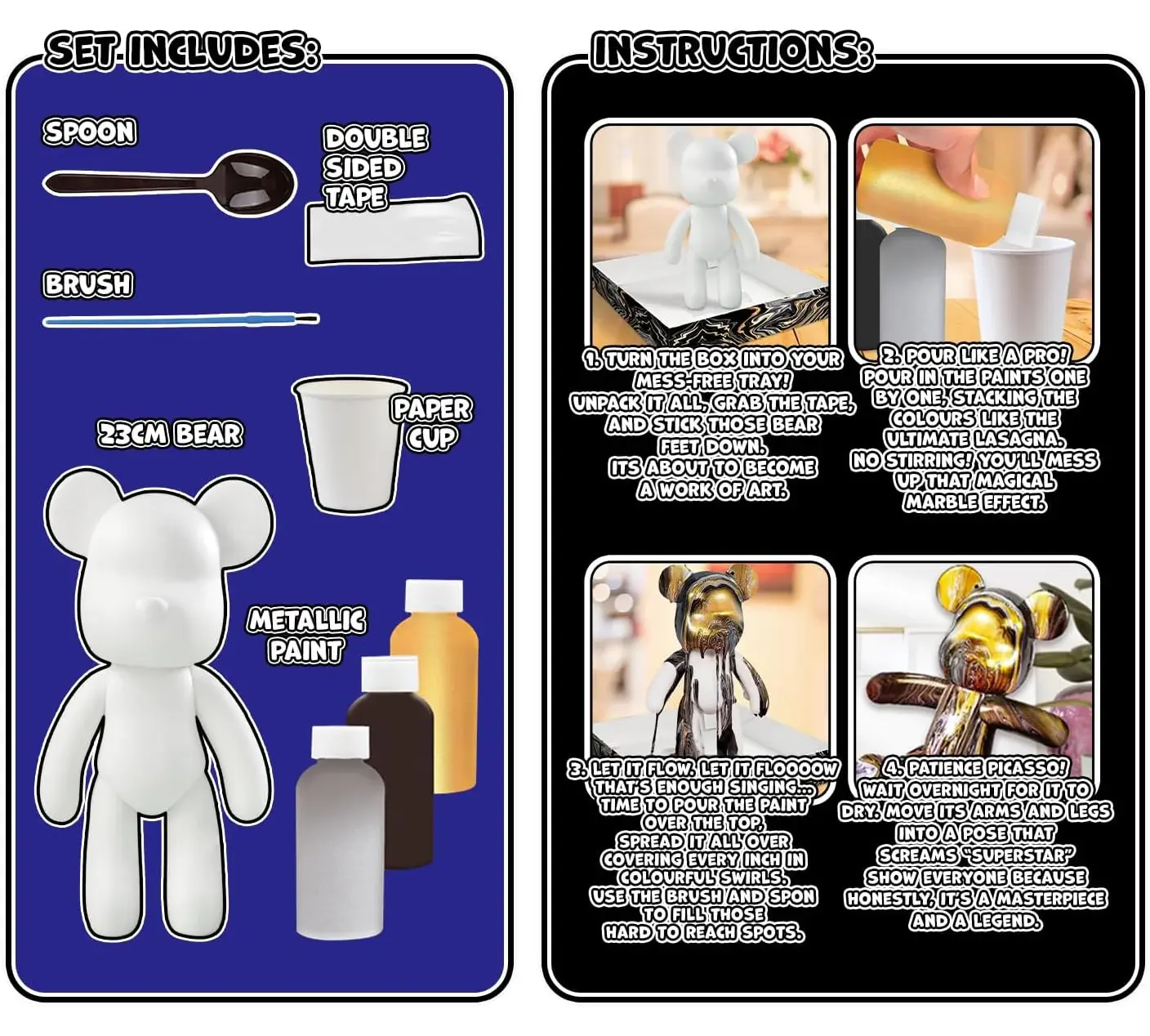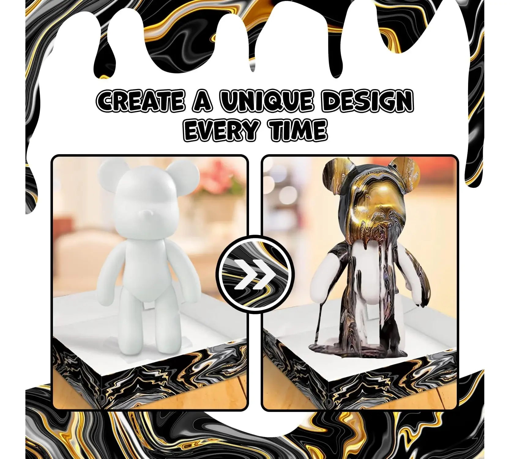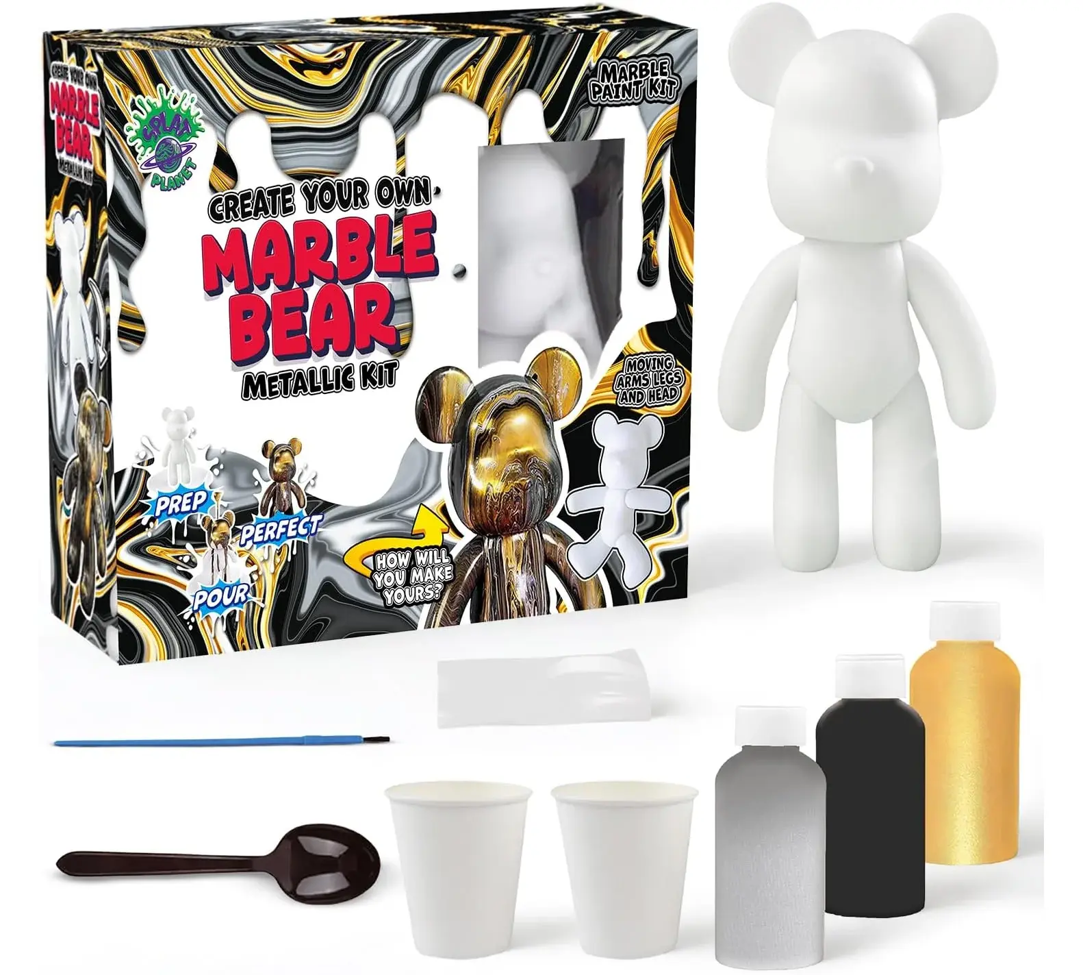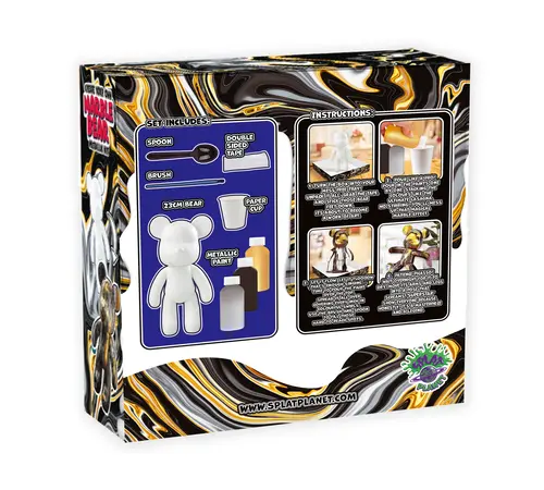 Φέρτε την τέχνη του Fluid Art στο σπίτι σας με το εντυπωσιακό σετ Metallic Marble Bear Kit της Splat Planet! Αυτό το πλήρες κιτ σας επιτρέπει να δημιουργήσετε τη δική σας, μοναδική φιγούρα αρκούδας με την τεχνική της ροής χρωμάτων (paint pouring), προσφέροντας ένα λαμπερό, μεταλλικό αποτέλεσμα που μαγνητίζει τα βλέμματα.