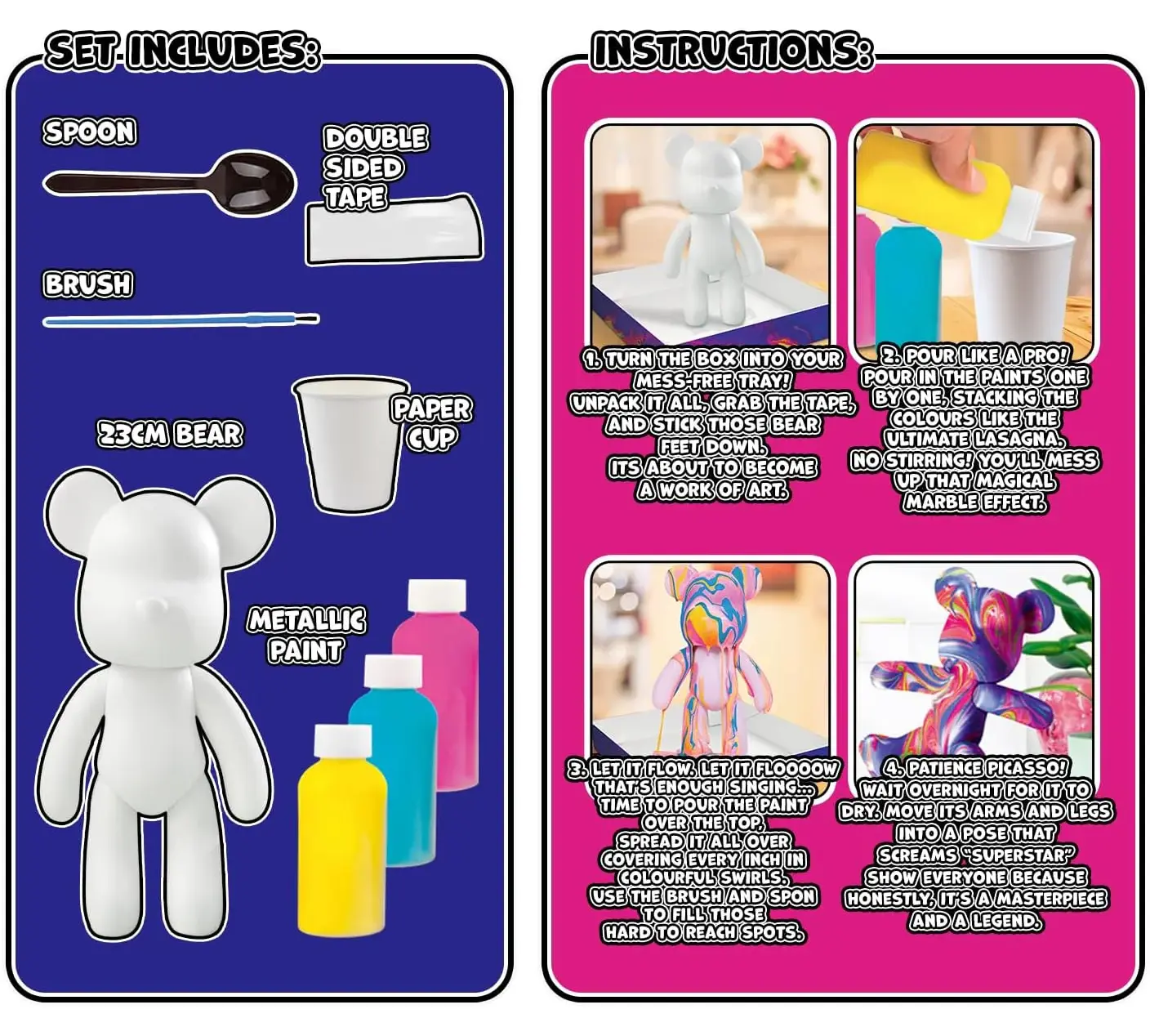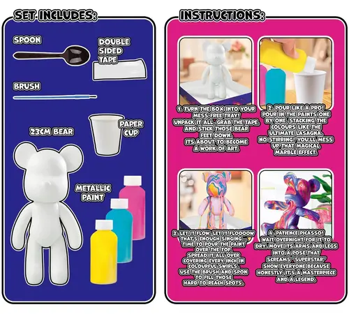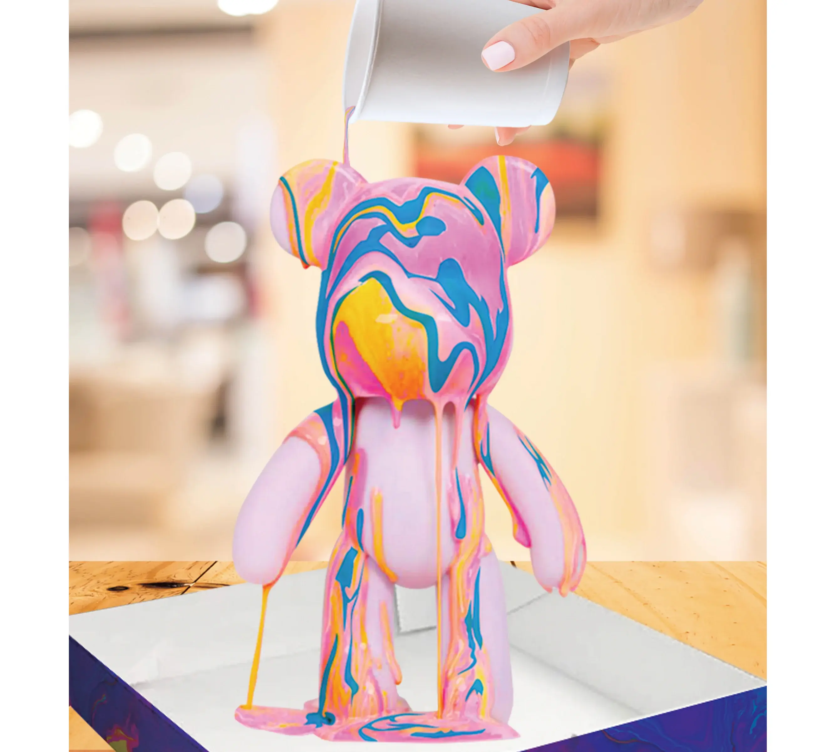 Ιδανικό για αρχάριους αλλά και για έμπειρους δημιουργούς κάθε ηλικίας, η διαδικασία είναι απλή, διασκεδαστική και άκρως δημιουργική. Απλώς αναμείξτε τα έντονα νέον χρώματα (neon paints), ρίξτε τα πάνω στη φιγούρα και παρακολουθήστε τα να ρέουν ελεύθερα, δημιουργώντας ανεπανάληπτα, ψυχεδελικά μαρμάρινα μοτίβα. Το καλύτερο; Η ίδια η συσκευασία μετατρέπεται έξυπνα σε ειδικό δίσκο (pouring tray), διατηρώντας τον χώρο σας απόλυτα καθαρό από χρώματα!