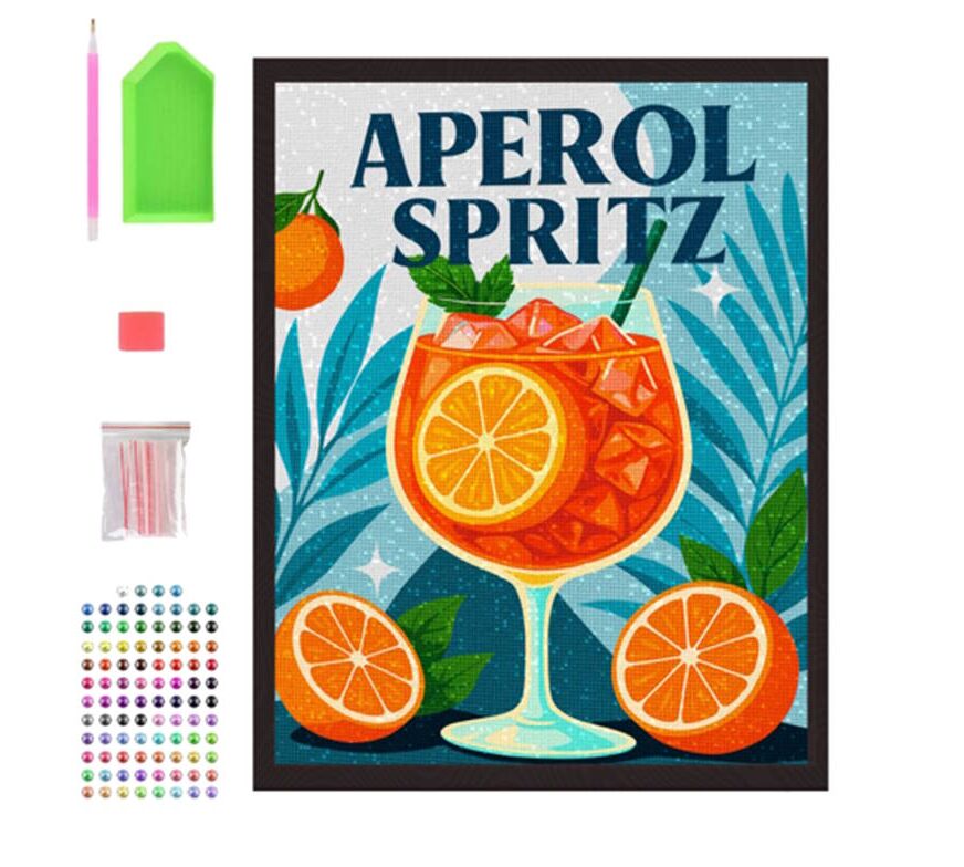 Ολοκληρωμένο σετ Diamond Painting "Aperol Spritz" από την Splat Planet. Περιλαμβάνει λινό καμβά 30x40cm προ-τοποθετημένο σε ξύλινο τελάρο, χρωματιστά διαμαντάκια και όλα τα απαραίτητα εργαλεία.