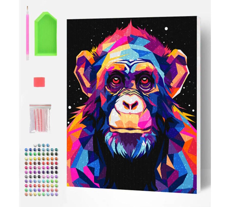 Ολοκληρωμένο σετ Diamond Painting "Chimpanzee" από την Splat Planet. Περιλαμβάνει λινό καμβά 30x40cm προ-τοποθετημένο σε ξύλινο τελάρο, χρωματιστά διαμαντάκια και όλα τα απαραίτητα εργαλεία.