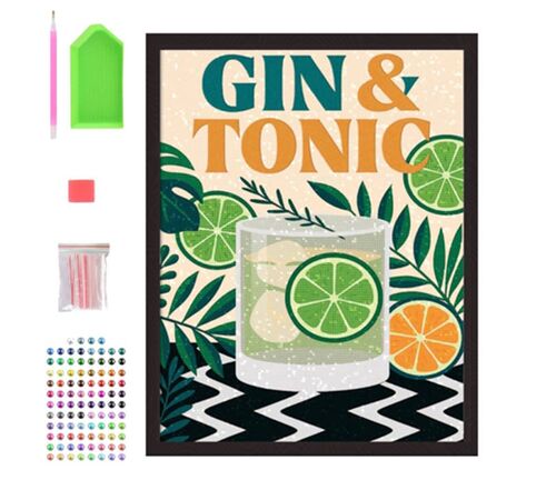 Ολοκληρωμένο σετ Diamond Painting "Gin and Tonic" από την Splat Planet. Περιλαμβάνει λινό καμβά 30x40cm προ-τοποθετημένο σε ξύλινο τελάρο, χρωματιστά διαμαντάκια και όλα τα απαραίτητα εργαλεία.