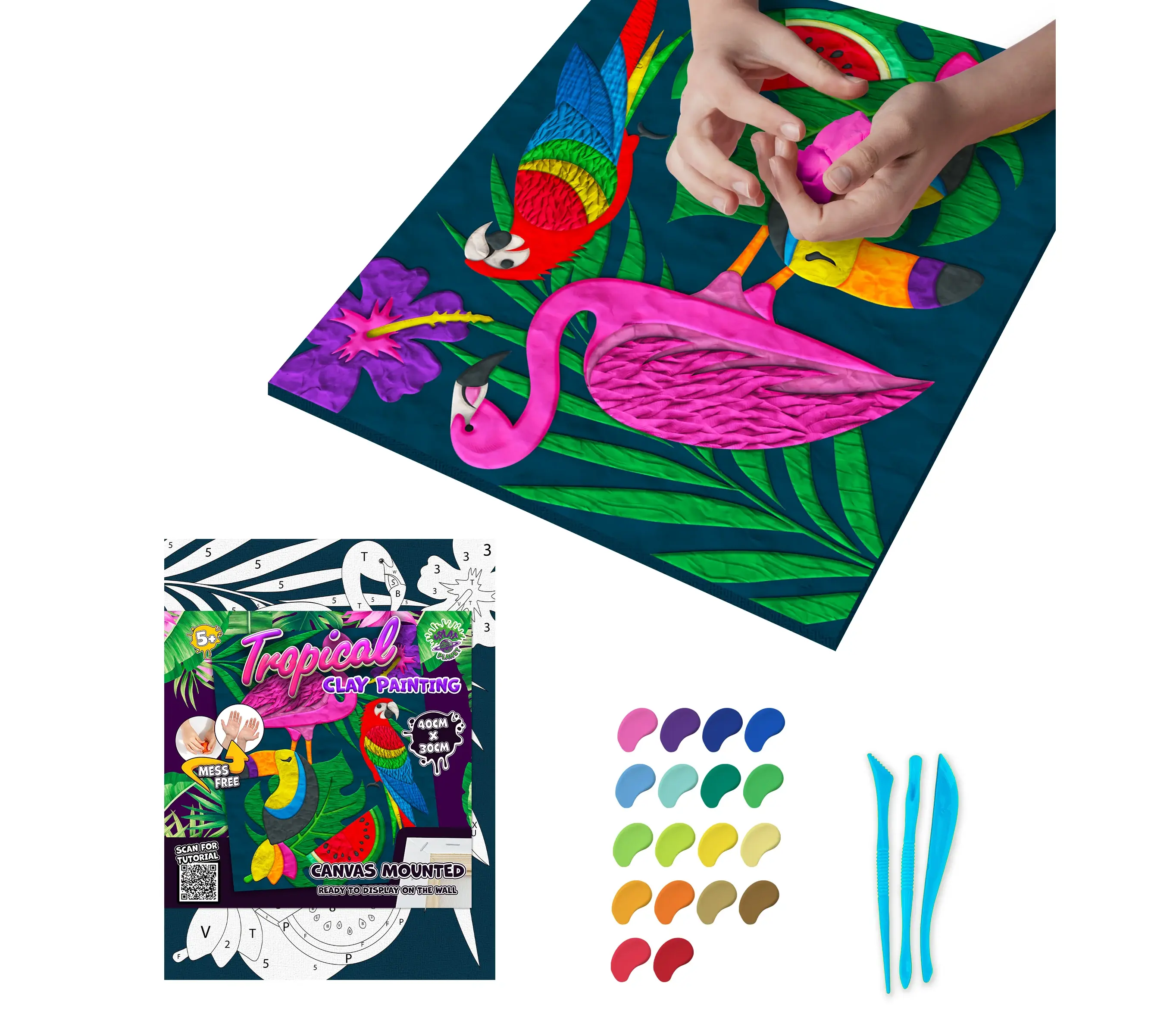 - Περιεχόμενα Συσκευασίας: 1 x Τεντωμένος Καμβάς σε τελάρο, Σετ Πολύχρωμων Πηλών, Εργαλεία Μοντελισμού