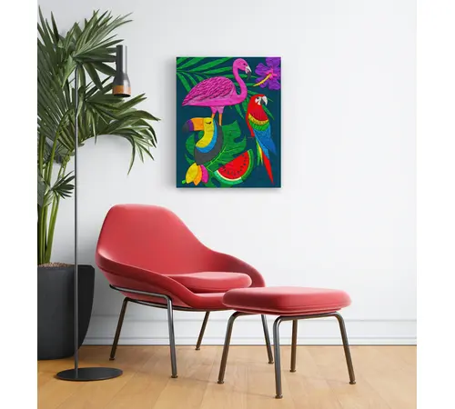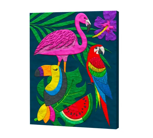 - Προ-εκτυπωμένο Καμβά: 100% λινό ύφασμα με το τροπικό σχέδιο, ήδη τοποθετημένο σε σταθερό ξύλινο πλαίσιο (τελάρο)