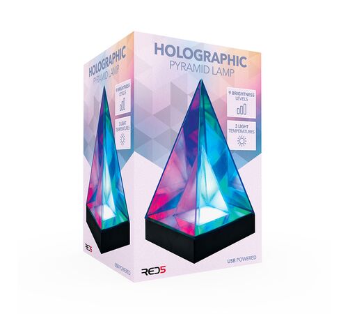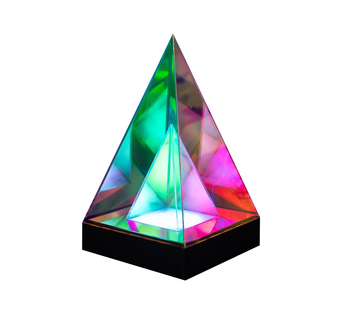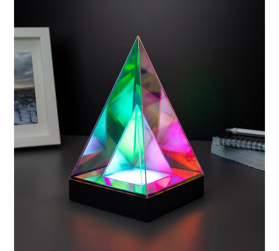 Με αυτήν την Holographic Pyramid Lamp, ο φωτισμός μετατρέπεται σε οπτική εμπειρία: μέσα από πολυδιάστατα μοτίβα και χρώματα, οι επιφάνειες του χώρου “ζωντανεύουν” με μαγικό τρόπο
